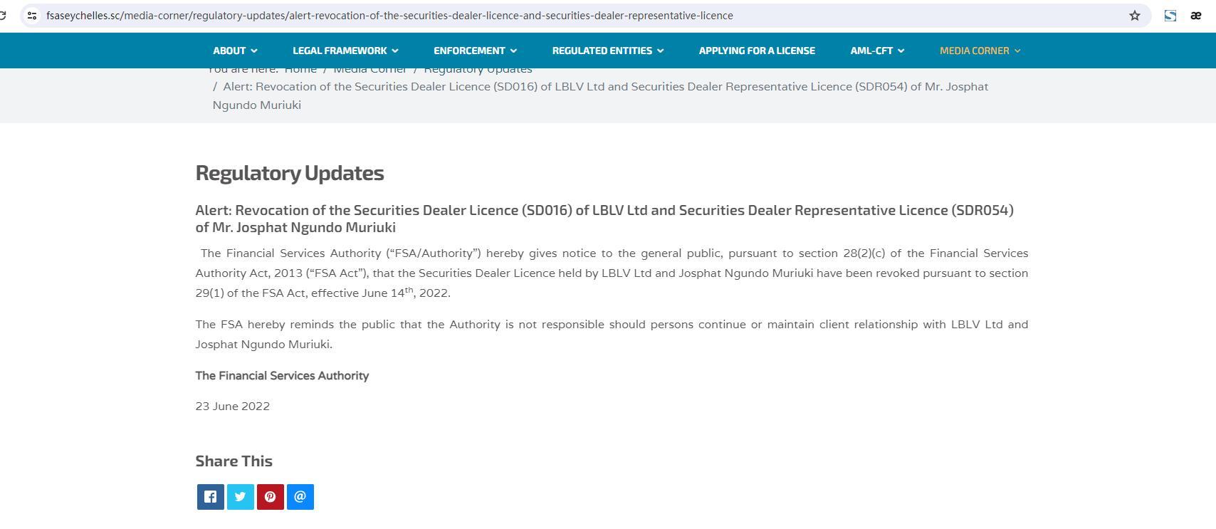 alerte mise à jour réglementaire : révocation du permis de courtier en valeurs mobilières (sd016) de LBLV Ltd et permis de représentant de courtier en valeurs mobilières (sdr054) de m. Josphat Ngundo Muriuki, l'autorité des services financiers (« fsa/autorité ») informe par la présente le grand public, conformément à l'article 28(2)(c) de la loi de 2013 sur l'autorité des services financiers (« loi fsa »), que les titres permis de concessionnaire détenu par LBLV Ltd et josphat ngundo muriuki ont été révoqués conformément à l'article 29 (1) de la loi sur la fsa, à compter du 14 juin 2022. la fsa rappelle par la présente au public que l'autorité n'est pas responsable si des personnes continuent ou maintiennent une relation client avec LBLV Ltd et Josphat Ngundo Muriuki. l'autorité des services financiers 23 juin 2022