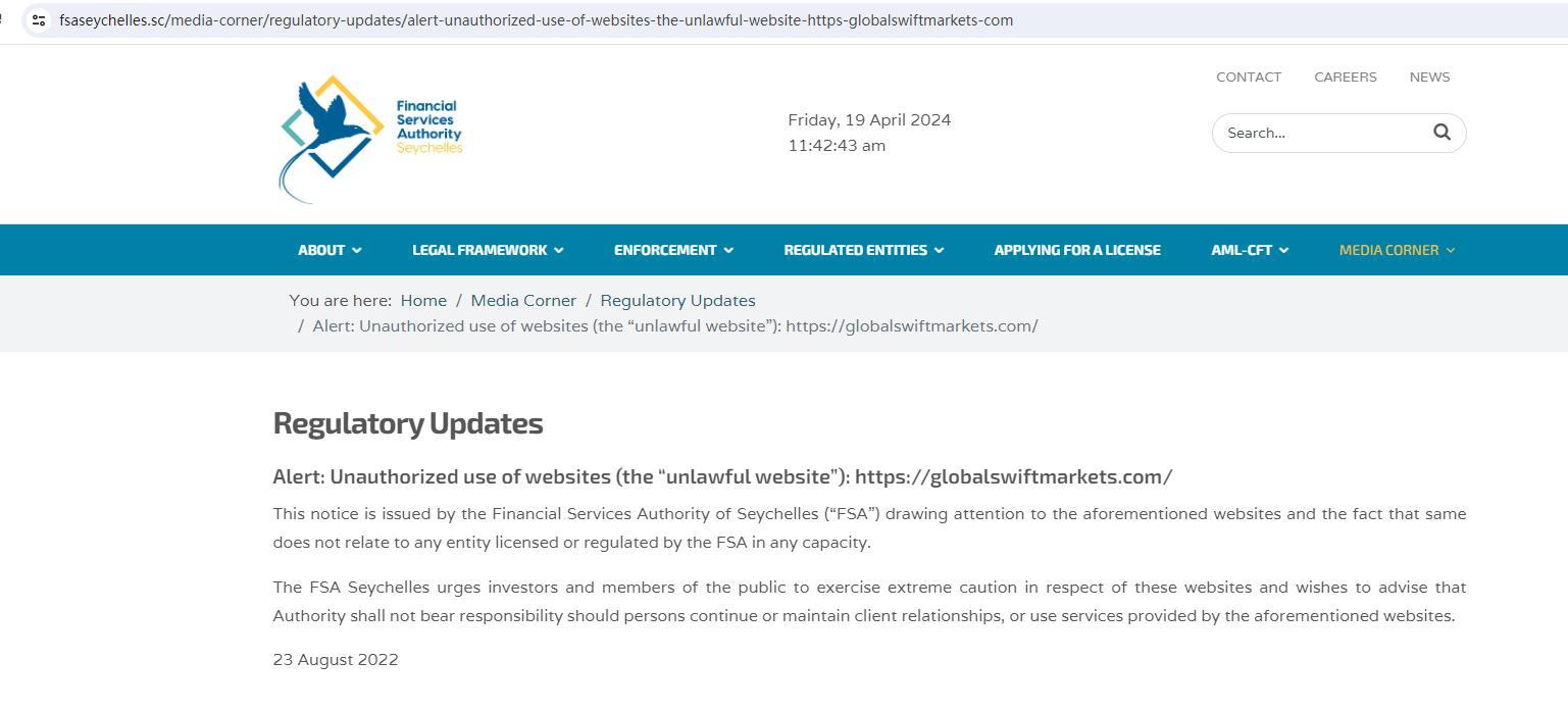 alerte actualité réglementaire : utilisation non autorisée de sites internet (le « site internet illicite ») : https:// Globalswiftmarkets .com/ cet avis est émis par l'autorité des services financiers des Seychelles (« fsa ») attirant l'attention sur les sites Web susmentionnés et sur le fait qu'ils ne concernent aucune entité agréée ou réglementée par la fsa à quelque titre que ce soit. la fsa seychelles exhorte les investisseurs et les membres du public à faire preuve d'une extrême prudence à l'égard de ces sites Web et souhaite informer que l'autorité ne saurait être tenue responsable si des personnes continuent ou entretiennent des relations avec des clients, ou utilisent les services fournis par les sites Web susmentionnés. 23 août 2022