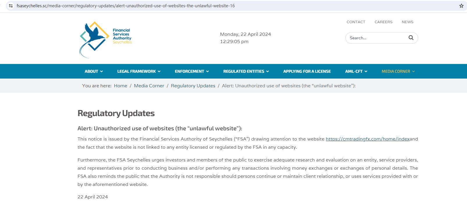alerte de mise à jour réglementaire : utilisation non autorisée de sites Web (le « site Web illégal ») : cet avis est émis par l'autorité des services financiers des Seychelles (« fsa ») attirant l'attention sur le site Web https:// Cmtradingfx .com/home/indexet le fait que le site Web n'est lié à aucune entité agréée ou réglementée par la fsa à quelque titre que ce soit. en outre, la fsa seychelles exhorte les investisseurs et les membres du public à effectuer des recherches et une évaluation adéquates sur une entité, des prestataires de services et des représentants avant de mener des affaires et/ou d'effectuer toute transaction impliquant des échanges d'argent ou des échanges de données personnelles. la fsa rappelle également au public que l'autorité n'est pas responsable si des personnes continuent ou maintiennent une relation client, ou utilisent des services fournis avec ou par le site Internet susmentionné. 22 avril 2024.