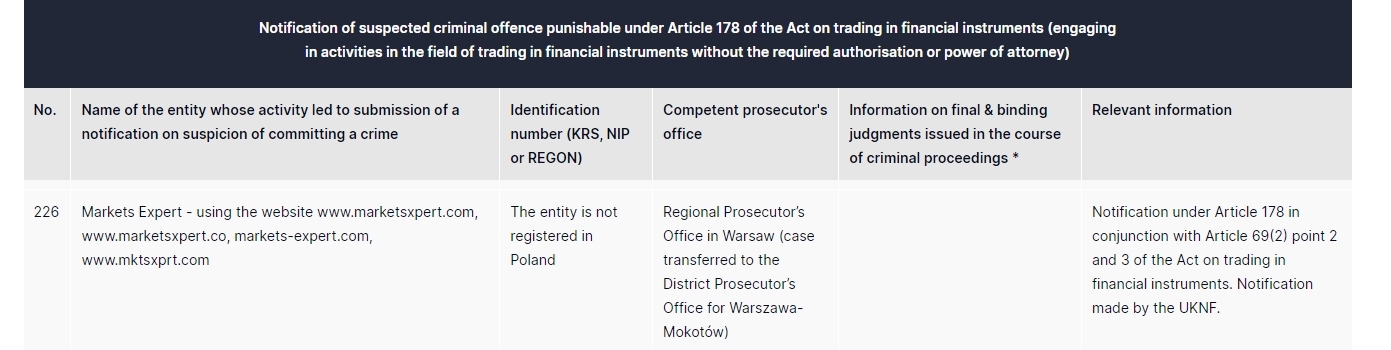 MARKETS EXPERT- en utilisant le site Internet www.marketsxpert.com, www.marketsxpert.co, marchés-expert.com, www.mktsxprt.com l'entité n'est pas enregistrée auprès du parquet régional de Pologne à Varsovie (affaire transférée au parquet du district de Varsovie- mokotów) notification au titre de l'article 178 en liaison avec l'article 69, paragraphe 2, points 2 et 3 de la loi sur le commerce d'instruments financiers. notification faite par l'uknf.