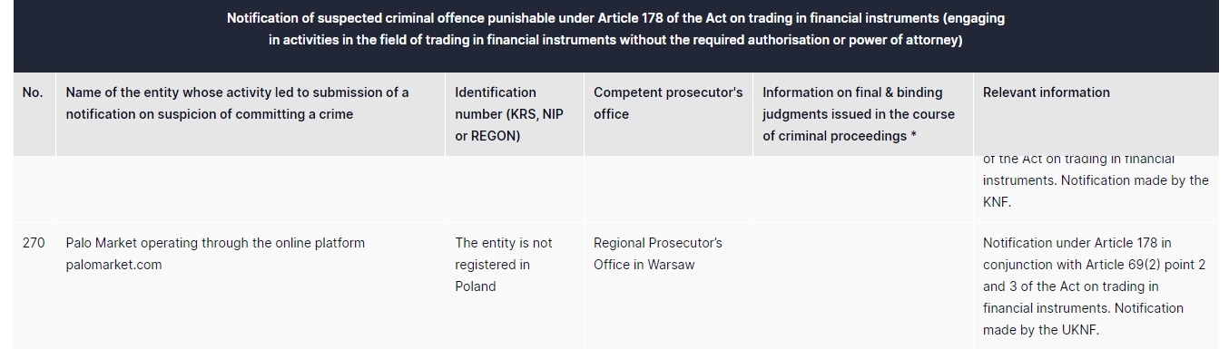 marché palo fonctionnant via la plateforme en ligne PALOmarket .com l'entité n'est pas enregistrée auprès du parquet régional de Pologne à Varsovie notification en vertu de l'article 178 en liaison avec l'article 69, paragraphe 2, points 2 et 3 de la loi sur le commerce d'instruments financiers. notification faite par l'uknf.
