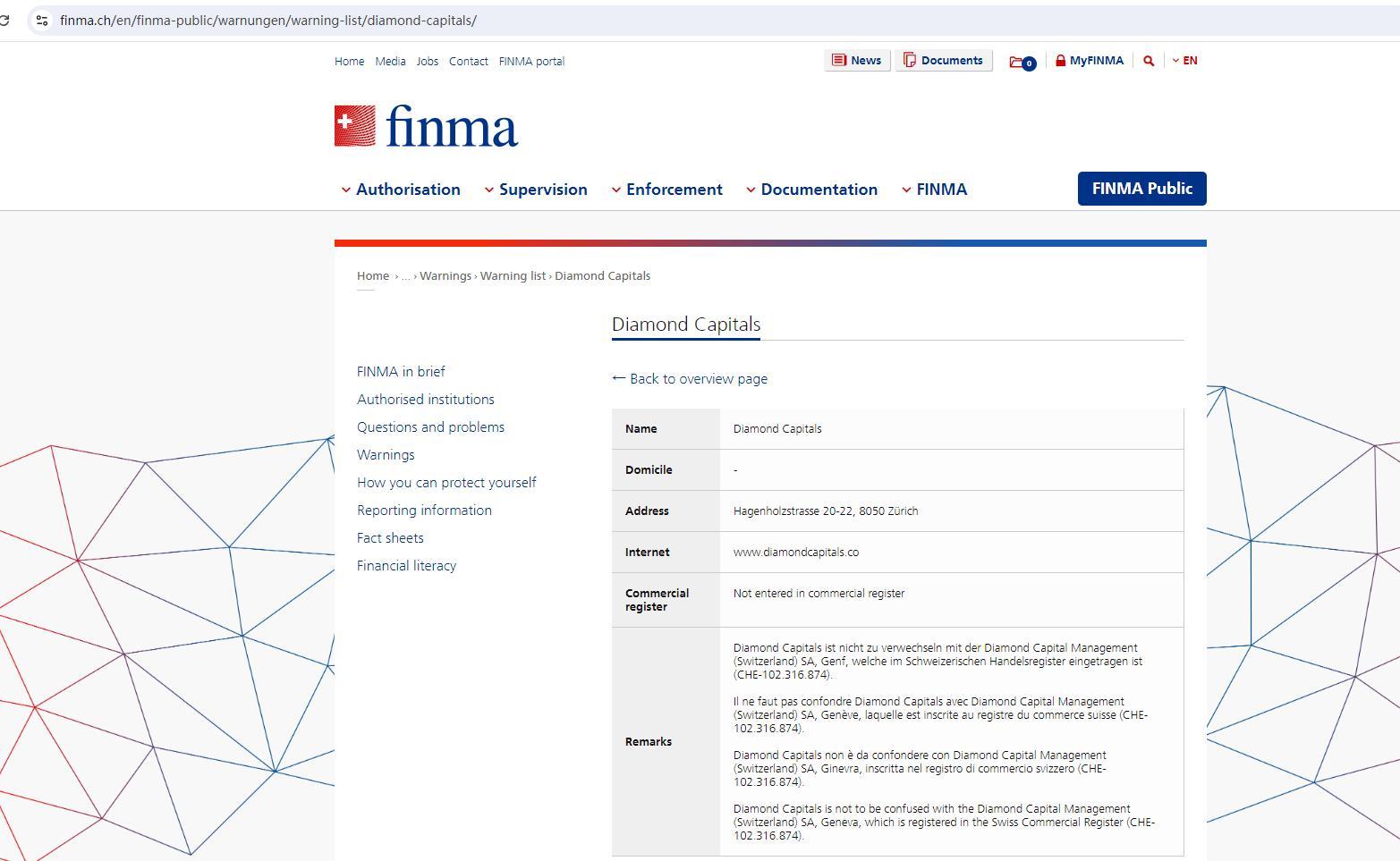 Liste d'avertissement des entreprises et individus non autorisés Liste d'avertissement - www.diamondcapitals.co.