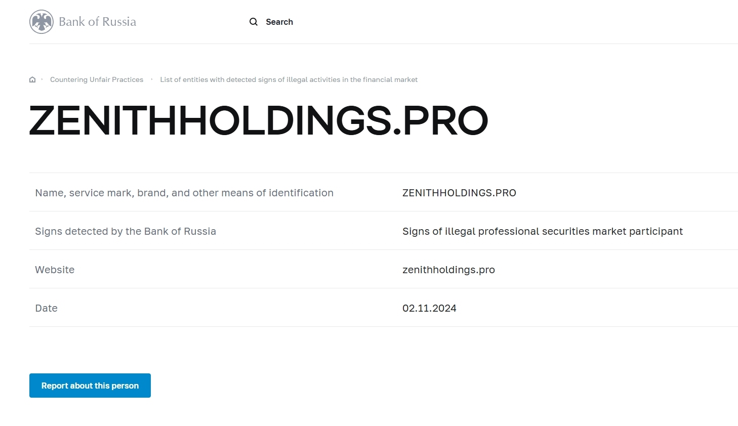 nom, marque de service, marque et autres moyens d'identification ZenithHoldings .pro signes détectés par la banque de Russie signes d'un site Web de participant professionnel illégal au marché des valeurs mobilières ZenithHoldings .pro date 02.11.2024