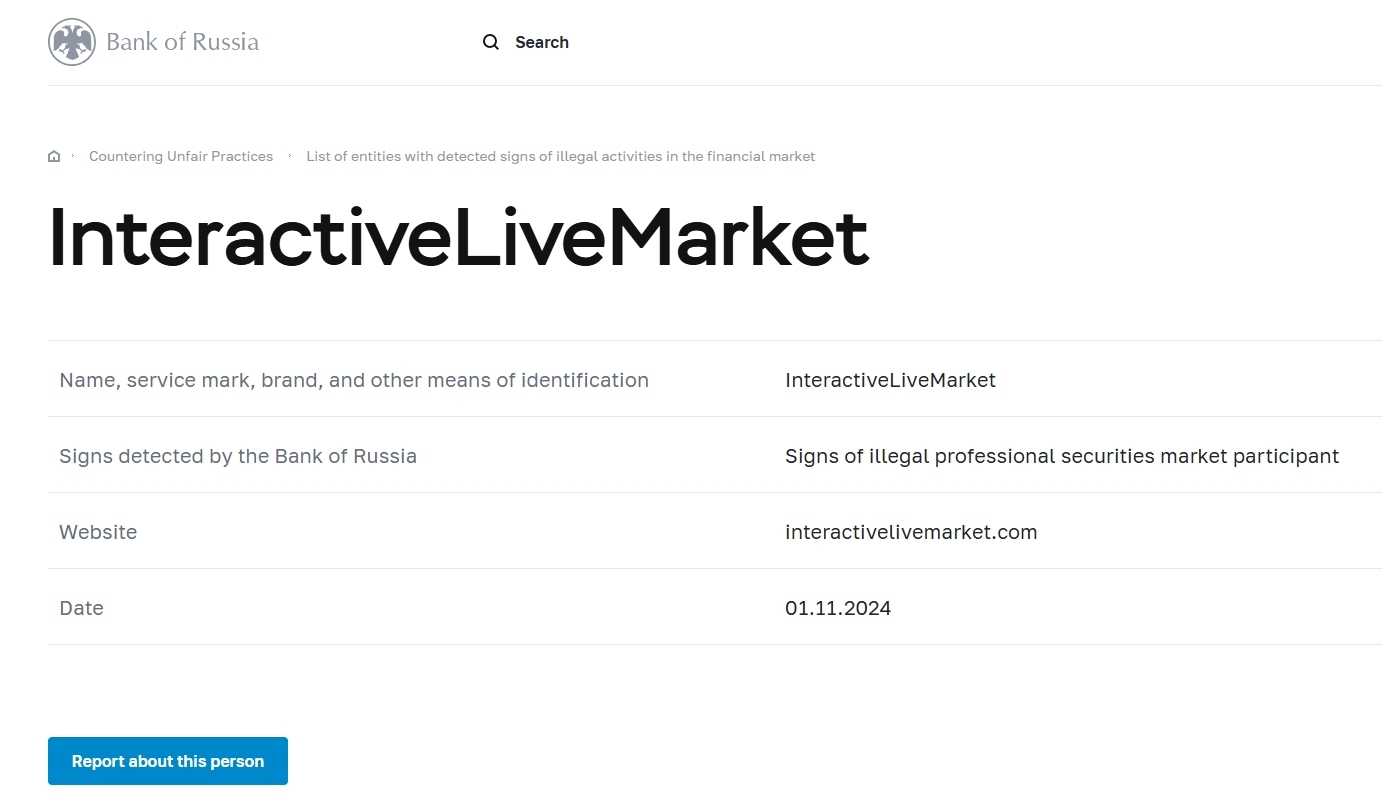 Nom, marque de service, marque et autres moyens d'identification InteractiveLiveMarket Signes détectés par la Banque de Russie Signes d'un participant professionnel illégal au marché des valeurs mobilières Site Internet interactivelivemarket.com Date 01.11.2024