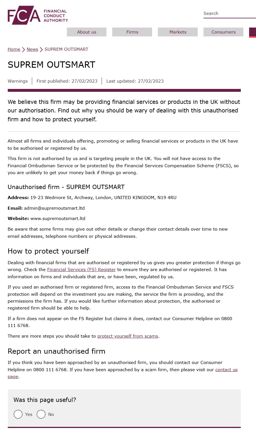 Liste d'avertissement de la FCA des entreprises non autorisées SUPREM OUTSMART.