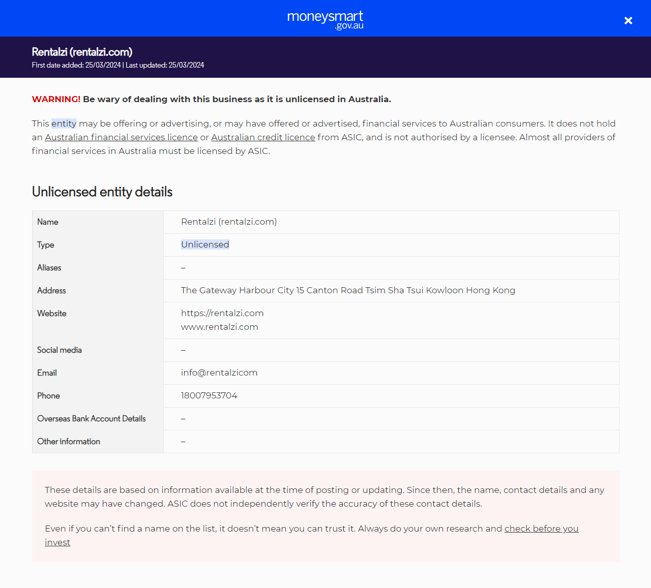 NomRentalzi (rentalzi.com)TypeNon agrééFourniture de services financiers (y compris des produits financiers) à des personnes en Australie sans licence. Ils ne détiennent pas de licence de services financiers australiens (AFS) ou de licence de crédit australienne de l'ASIC. Alias– AdresseThe Gateway Harbour City 15 Canton Road Tsim Sha Tsui Kowloon Hong Kong Site webhttps://rentalzi.com www.rentalzi.com Réseaux sociaux– Emailinfo@rentalzicom Téléphone18007953704 Coordonnées bancaires à l'étranger– Autres informations–.