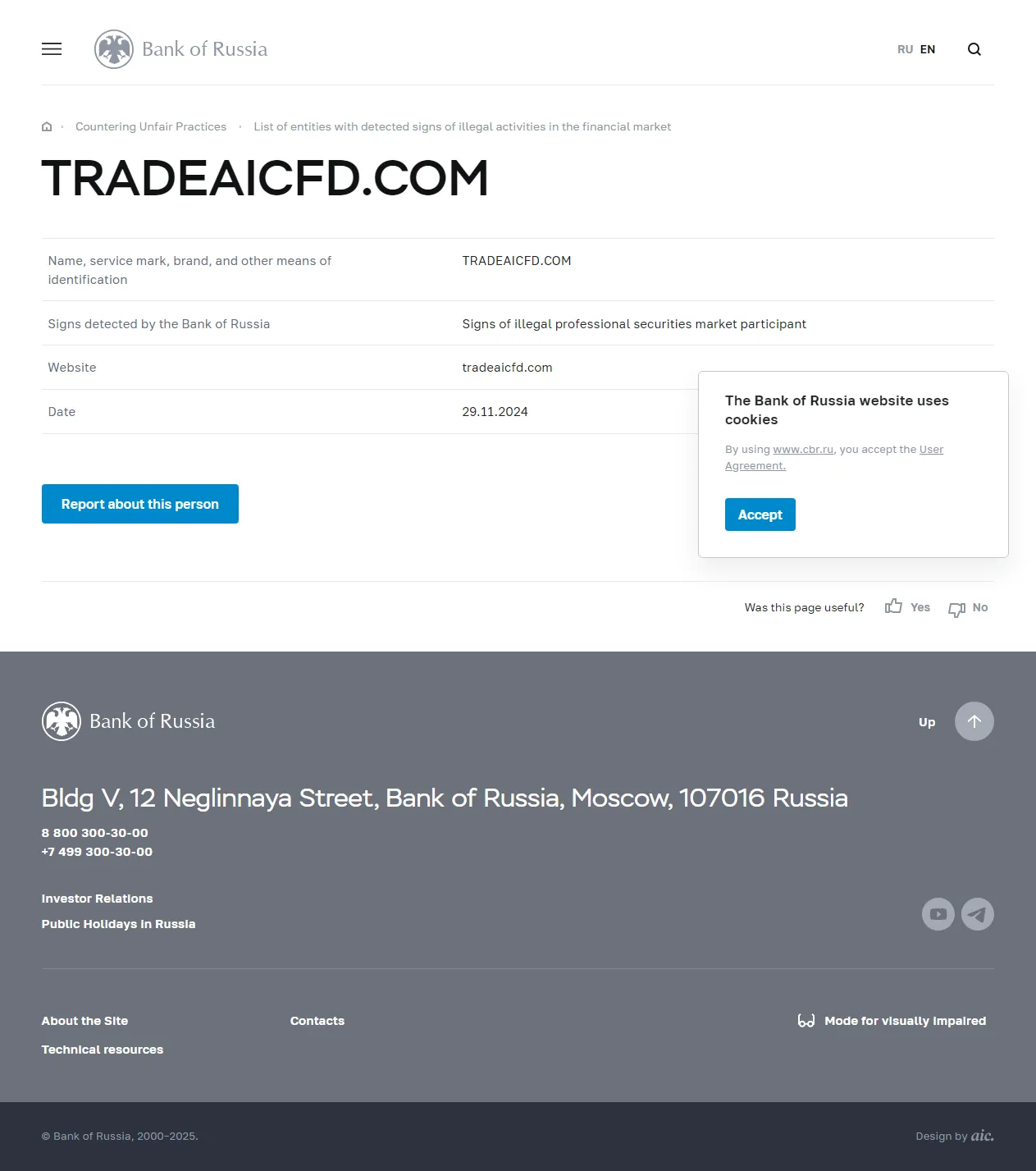Nom, marque de service, marque et autres moyens d'identification TRADEAICFD.COM Signes détectés par la Banque de Russie Signes de participant professionnel illégal au marché des titres Site web tradeaicfd.com Date 29.11.2024.