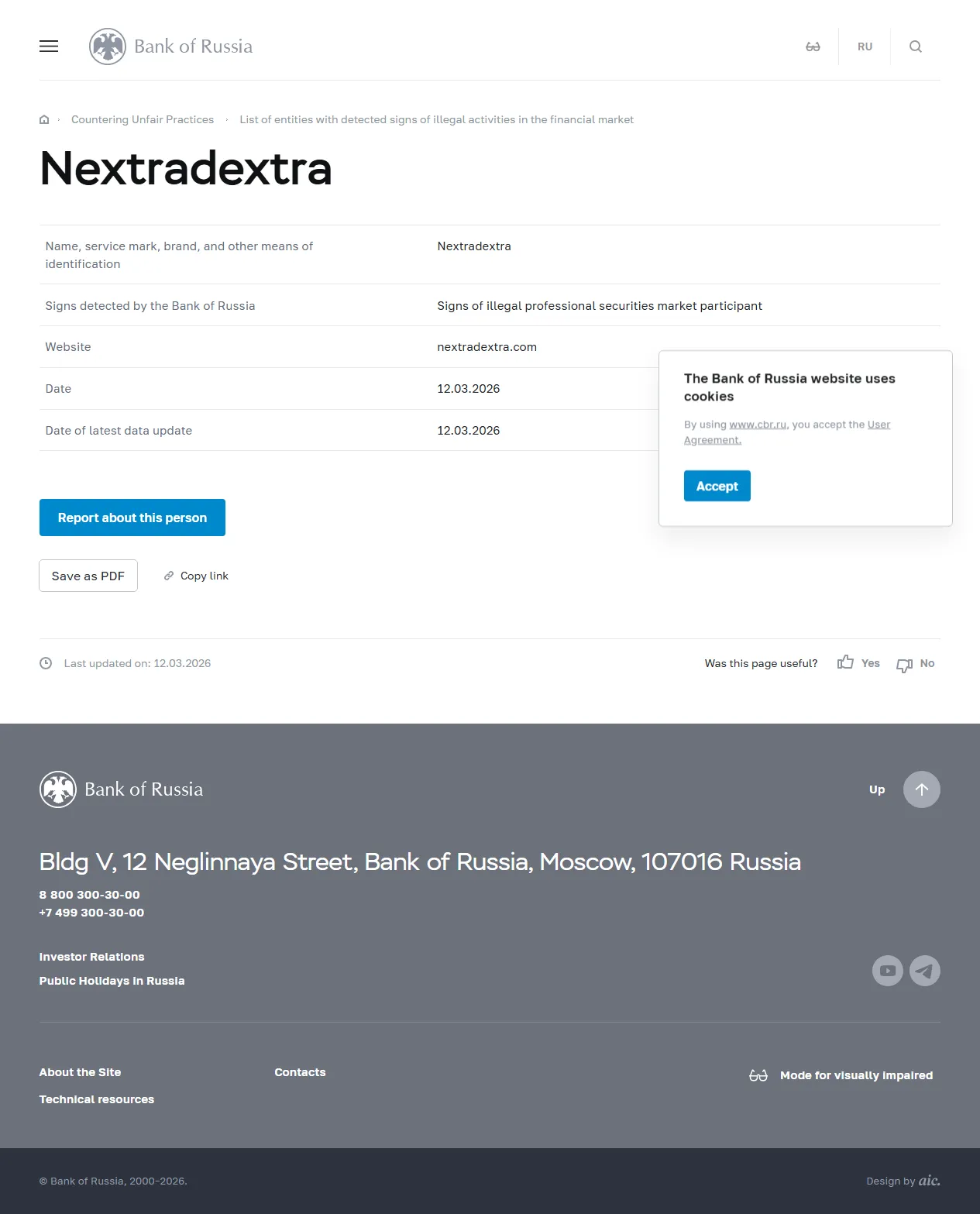 Nom, marque de service, marque et autres moyens d'identification Nextradextra Signes détectés par la Banque de Russie Signes de participant illégal au marché professionnel des valeurs mobilières Site web nextradextra.com Date 12.03.2026 Date de la dernière mise à jour des données 12.03.2026.