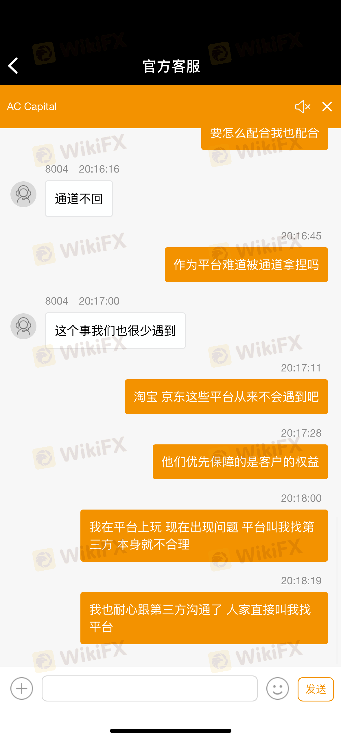 在AC平台入金1000美金,然后迟迟未到账,联系客服回复通道把款给扣了,不下发。联系客户经理,一天不说一句话,一直说在联系。连续四天,问题一直不解决,完全不考虑顾客利益,一直推脱!