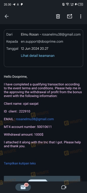 Je suis Nguyễn Quốc Trường. Numéro de compte . Je viens du Vietnam. Le 11/06/2025, j'ai déposé 1500 USD sur mon compte de trading MT4 60034657. Du 11/06/2025 au 16/06/2025, j'ai tradé en suivant la tendance haussière du XAUUSD, avec 23 ordres de trading, un volume de trading de 2.45lot XAUUSD, pour un profit total de 3557.4usd. J'ai tradé entièrement manuellement, en passant des ordres manuels avec des TP/SL définis, et dans certains cas, j'ai fermé manuellement les ordres lorsque je jugeais le profit suffisant. J'ai simplement tradé en suivant la tendance haussière du XAUUSD, sans fraude, sans manipulation du marché, et sans abus de bonus car je n'ai pas utilisé le bonus de 10% qui m'était offert. niveau. Cependant, Dooprime a déduit la totalité des bénéfices 3557.4usd sans fournir aucune preuve. Je demande à Dooprime de verser mes bénéfices légitimes. Si Dooprime ne prend pas de mesures, je signalerai à la police vietnamienne pour qu'elle applique des mesures de blocage, d'enquête et de traitement des actes frauduleux de Dooprime.