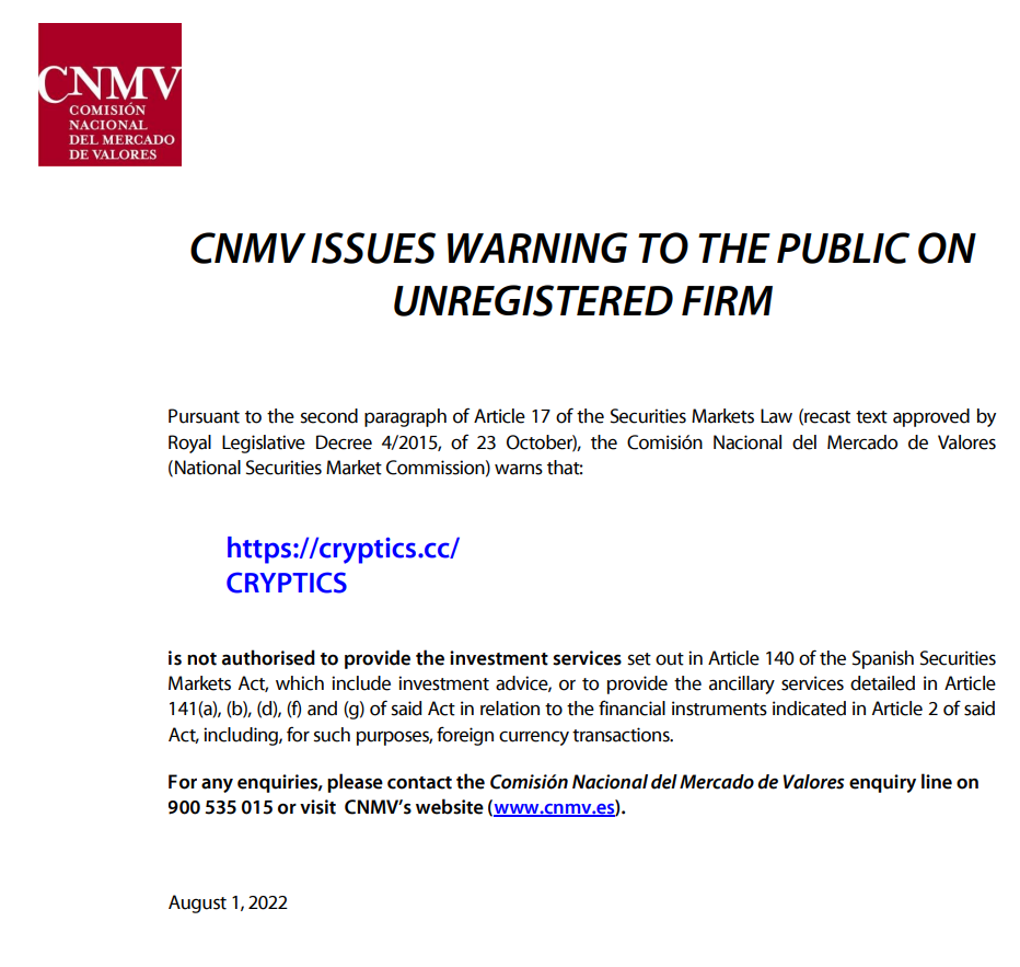 Cryptics(https:// Cryptics .cc/) 02/08/2022 espagne cnmv émet un avertissement au public sur les sociétés non enregistrées conformément au deuxième alinéa de l'article 17 de la loi sur les marchés de valeurs mobilières (texte de refonte approuvé par le décret législatif royal 4/2015 du 23 octobre), le La comisión nacional del mercado de valores (commission nationale du marché des valeurs mobilières) prévient que : Cryptics n'est pas autorisé à fournir les services d'investissement prévus à l'article 140 de la loi espagnole sur les marchés de valeurs mobilières, qui incluent le conseil en investissement, ni à fournir les services auxiliaires détaillés à l'article 141(a), (b), (d), (f) et (g) dudit acte en ce qui concerne les instruments financiers indiqués à l'article 2 dudit acte, y compris, à ces fins, les transactions en devises. pour toute demande de renseignements, veuillez contacter la ligne de renseignements de la Comisión nacional del mercado de valores au 900 535 015 ou visiter le site Web de la CNMV (www.cnmv.es). 1 août 2022