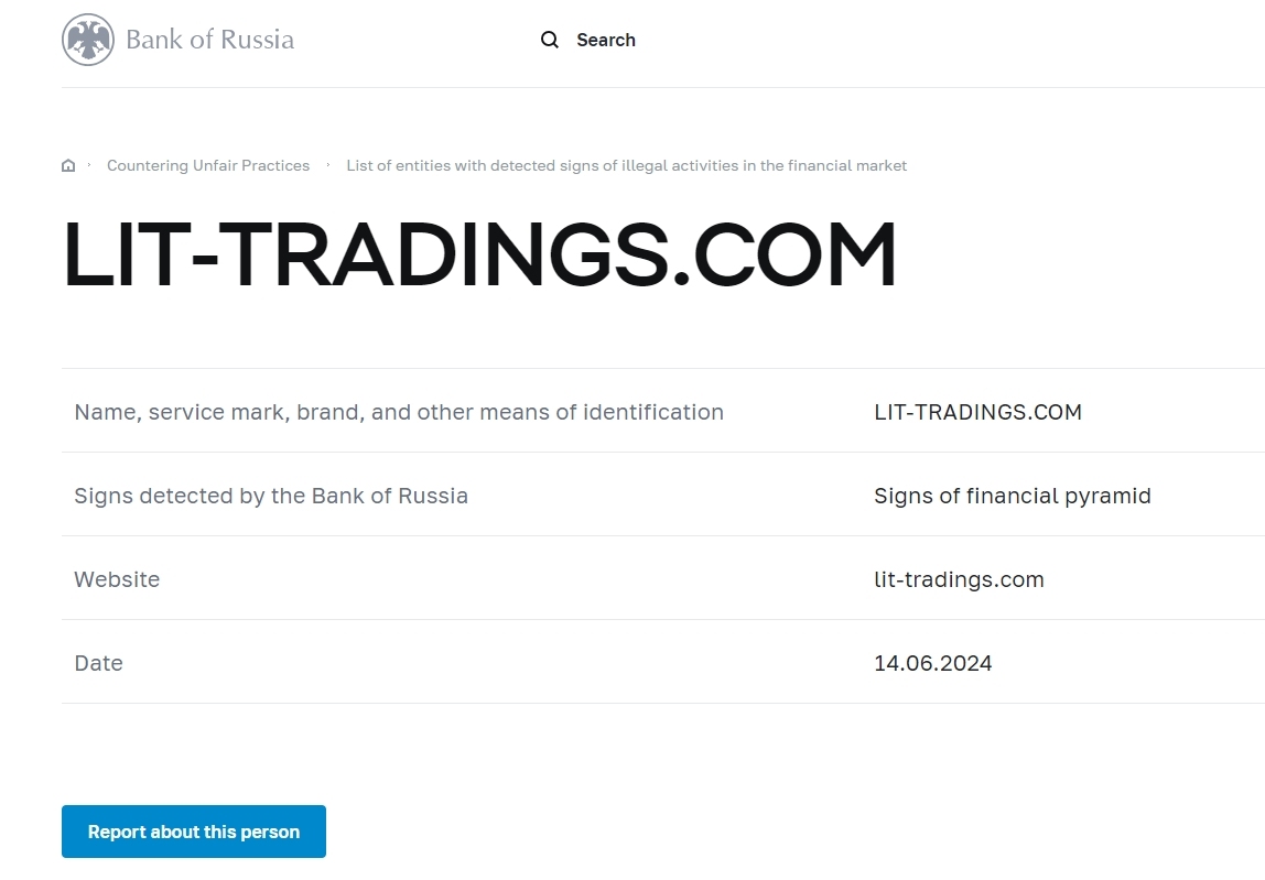 Nom, marque de service, marque et autres moyens d'identification LIT-TRADINGS.COM Signes détectés par la Banque de Russie Signes de pyramide financière Site Internet lit-tradings.com Date 14.06.2024