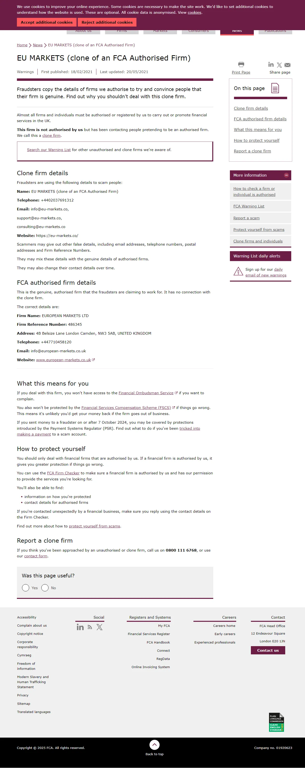 Les fraudeurs copient les détails des sociétés que nous autorisons pour essayer de convaincre les gens que leur société est authentique. Découvrez pourquoi vous ne devriez pas traiter avec cette société clone. Presque toutes les sociétés et tous les individus doivent être autorisés ou enregistrés par nous pour exercer ou promouvoir des services financiers au Royaume-Uni. Cette société n'est pas autorisée par nous mais a contacté des personnes en prétendant être une société autorisée. Nous Appel cela une société clone. Recherchez dans notre Liste d'Avertissement d'autres sociétés non autorisées et clones dont nous avons connaissance. Détails de la société clone Les fraudeurs utilisent les détails suivants pour Arnaque les gens : Nom : EU MARKETS (clone d'une société autorisée par la FCA) Téléphone : +4402037691312 Email : info@eu-markets.co,support@eu-markets.co,consulting@eu-markets.co Site web : https://eu-markets.co/ Les escrocs peuvent fournir d'autres faux détails, y compris des adresses email, des numéros de téléphone, des adresses postales et des numéros de référence de société. Ils peuvent mélanger ces détails avec les détails authentiques de sociétés autorisées. Ils peuvent également modifier leurs coordonnées au fil du temps. Détails de la société autorisée par la FCA Il s'agit de la société authentique et autorisée pour laquelle les fraudeurs prétendent travailler. Elle n'a aucun lien avec la société clone. Les détails corrects sont : Nom de la société : EUROPEAN MARKETS LTD Numéro de référence de la société : 486345 Adresse : 4B Belsize Lane London Camden, NW3 5AB, ROYAUME-UNI Téléphone : +447710458120 Email : info@european-markets.co.uk Site web : www.european-markets.co.uk.
