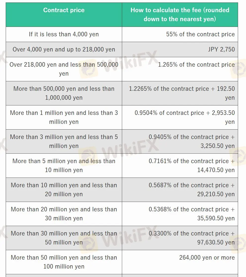 ¥4,000 से कम अनुबंधों के लिए, शुल्क मूल्य का 55% है। अनुबंधों के लिए बड़े अनुबंधों के बीच एक समान राशि ¥2,750 से शुल्क और प्रतिशत आधारित शुल्क जोड़कर राशि होती है जो ¥218,000 से अधिक होती है।