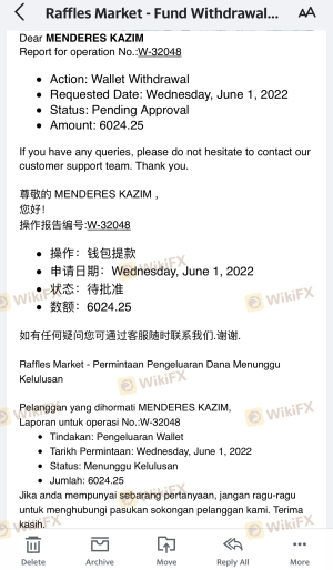 मैंने कई हफ्तों तक रैफल्स मार्केट में ट्रेड किया। मैंने कई बार शूटिंग की और भुगतान हो गया। हालांकि, मैंने अपने पिछले लेनदेन से 6024,25 यूएसडी कमाया है और मैं 1 जून 2022 को इस पैसे को वापस लेना चाहता था। लेकिन 10 दिनों के बाद भी मुझे भुगतान नहीं मिल रहा है। जब मैं ई-मेल के माध्यम से संपर्क करता हूं, तो यह कहता है कि पैसे की प्रतीक्षा करें, भुगतान किया जाएगा। मैं ऐसी कंपनी पर कभी भरोसा नहीं करता जिससे मुझे अपना पैसा नहीं मिल सकता। मेरे लिए यह धोखाधड़ी के समान है। यदि यह कंपनी मुझे भुगतान नहीं करती है, तो आप सुनिश्चित हो सकते हैं कि मैं सोशल मीडिया के माध्यम से सभी चैनलों के माध्यम से और सभी विनियमित लाइसेंस अधिकारियों को आवश्यक शिकायतें कर दूंगा। मुझे आपकी मदद की उम्मीद है।