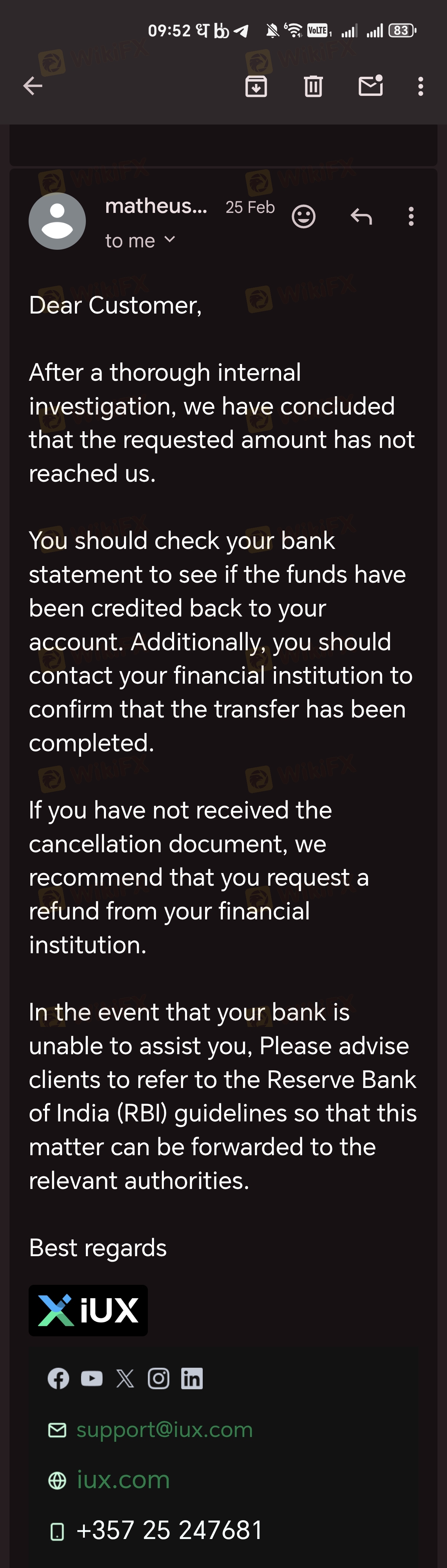 दोहराया गया \"जमा राशि गायब\" जिसका कभी समाधान नहीं होता – बड़ा खतरे का संकेत यह अब दूसरी बार है जब मुझे IUX के साथ यही समस्या का सामना करना पड़ रहा है। मेरी जमा राशि सफलतापूर्वक डेबिट कर दी गई थी और मैंने UTR सहित पूरा प्रमाण प्रदान किया। फिर भी, मुझे एक मानक प्रतिक्रिया मिली कि धन \"प्राप्त नहीं हुआ\" और मुझे अपने बैंक से जांच करनी चाहिए। यहां गंभीर चिंता का विषय है: पिछले साल मेरे साथ ठीक यही बात हुई थी। उस समय भी, मुझे बताया गया था कि धन \"प्राप्त नहीं हुआ"। कई अनुवर्ती कार्रवाइयों के बाद, राशि अंततः जमा कर दी गई। तो सवाल सीधा है: अगर धन प्राप्त नहीं हुआ था, तो बाद में वह कैसे जमा किया गया? यह एक स्पष्ट पैटर्न दिखाता है — जमा राशियों को शुरू में अस्वीकार कर दिया जाता है और केवल बार-बार अनुवर्ती कार्रवाइयों के बाद स्वीकार किया जाता है। एक वित्तीय प्लेटफॉर्म के लिए, यह अत्यंत चिंताजनक है। ग्राहकों को अपने पैसे डेबिट हो जाने के बाद उसके पीछे भागना नहीं चाहिए। मेरे पास लेनदेन और संचार का पूरा प्रमाण है। मैं व्यापारियों को जमा/निकासी की विश्वसनीयता के संबंध में सावधान रहने की सलाह देता हूं।