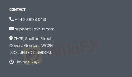 भौतिक पता: मेल संदेश या व्यक्तिगत दौरे के लिए, A2Z FX का 71-75, शेल्टन स्ट्रीट, कोवेंट गार्डन, WC2H 9JQ, यूनाइटेड किंगडम पर स्थान है। यह जब आवश्यक हो तो सीधे बातचीत के लिए एक माध्यम या भौतिक दस्तावेजों भेजने के लिए एक मार्ग प्रदान करता है।