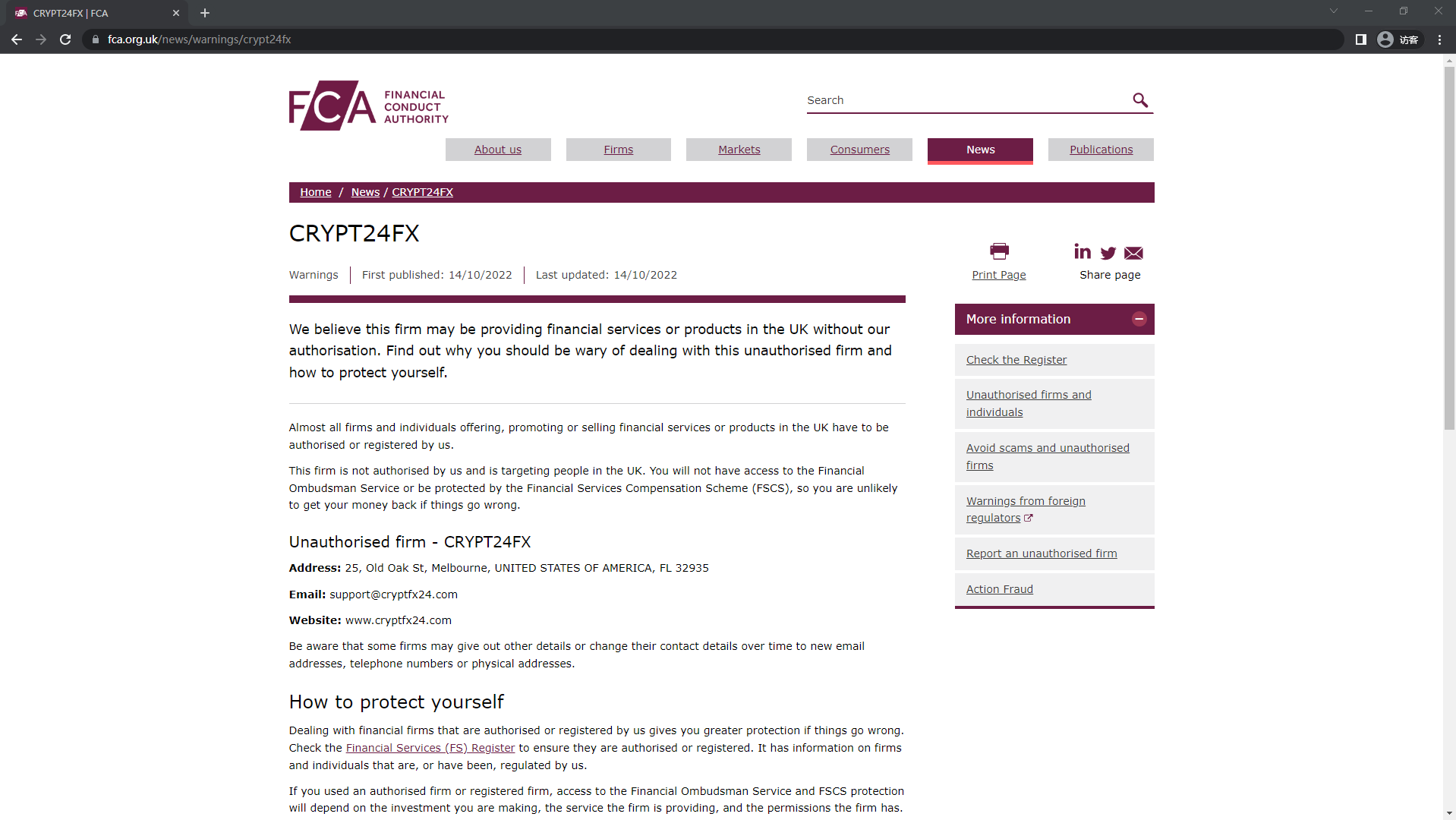 FCA द्वारा अनधिकृत फर्मों की चेतावनी सूची CRYPT24FX.