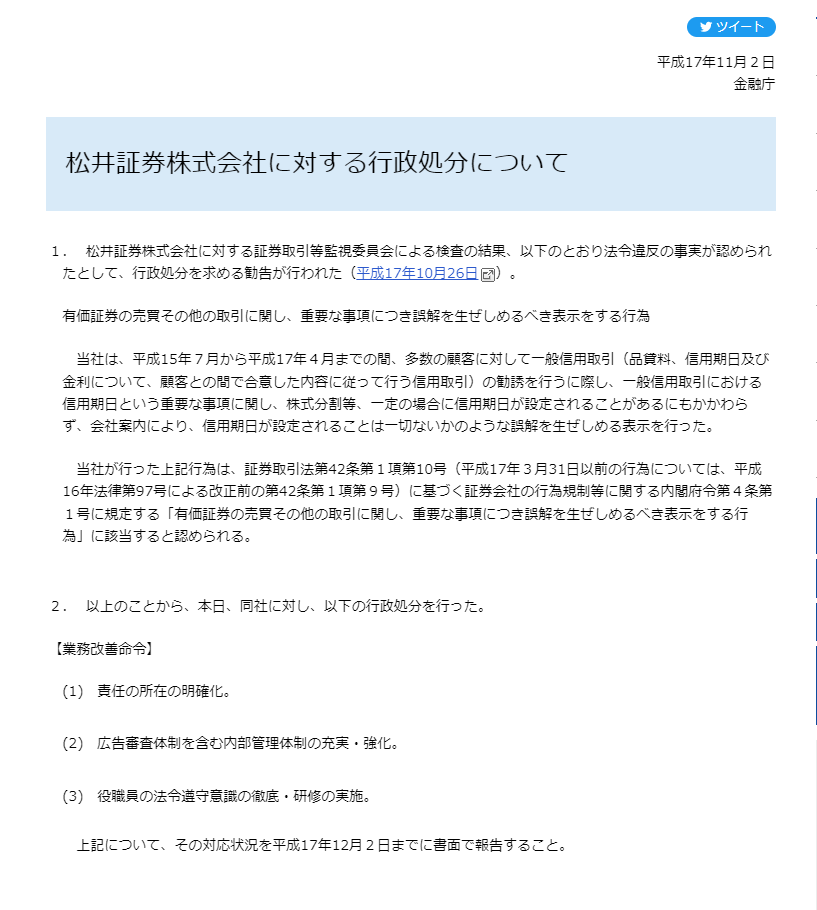 2 नवंबर, 2005 वित्तीय सेवा एजेंसी Matsui ज्वाइंट स्टॉक कंपनियों के खिलाफ प्रशासनिक कार्रवाई 1. Matsui स्टॉक कंपनी के प्रतिभूति और विनिमय निगरानी आयोग द्वारा निरीक्षण के परिणामस्वरूप, कानूनों और विनियमों के उल्लंघन के तथ्य को निम्नानुसार पहचाना गया, और प्रशासनिक कार्रवाई के लिए एक सिफारिश की गई (26 अक्टूबर, 2005, एक नई विंडो में खुली) ) . प्रतिभूतियों और अन्य लेन-देन की बिक्री और खरीद के संबंध में महत्वपूर्ण मामलों के भ्रामक प्रतिनिधित्व करने के कार्य। क्रेडिट लेनदेन की मांग करते समय (ऋण शुल्क, क्रेडिट अवधि और ब्याज दर के संबंध में ग्राहक के साथ सहमत विवरण के अनुसार मार्जिन ट्रेडिंग), महत्वपूर्ण के संबंध में सामान्य मार्जिन ट्रेडिंग में क्रेडिट अवधि का मामला, कुछ मामलों में जैसे स्टॉक विभाजन, इस तथ्य के बावजूद कि देय तिथियां निर्धारित की जा सकती हैं, कंपनी ब्रोशर ने भ्रामक रूप से संकेत दिया कि क्रेडिट देय तिथियां कभी भी निर्धारित नहीं की गई थीं। कंपनी द्वारा उपरोक्त कार्य प्रतिभूति और विनिमय कानून के अनुच्छेद 42, अनुच्छेद 1, मद 10 के अनुच्छेद 4 के अनुसार हैं, मद 9 के आधार पर प्रतिभूति कंपनियों के कैबिनेट कार्यालय अध्यादेश संबंधी अधिनियम विनियमों आदि के मद 1 के अनुसार हैं), " प्रतिभूतियों और अन्य लेनदेन की बिक्री और खरीद के संबंध में महत्वपूर्ण मामलों के भ्रामक प्रतिनिधित्व करने के अधिनियमों के तहत आने के रूप में मान्यता प्राप्त है 2. उपरोक्त के आधार पर आज कंपनी के खिलाफ निम्नलिखित प्रशासनिक कार्रवाई की गई। [व्यवसाय सुधार आदेश] (1) उत्तरदायित्व का स्पष्टीकरण। (2) विज्ञापन स्क्रीनिंग प्रणाली सहित आंतरिक नियंत्रण प्रणाली का संवर्धन और सुदृढ़ीकरण। (3) अधिकारियों और कर्मचारियों के बीच अनुपालन जागरूकता सुनिश्चित करना और प्रशिक्षण आयोजित करना। उपरोक्त के संबंध में, कृपया 2 दिसंबर, 2005 तक लिखित रूप में प्रतिक्रिया की स्थिति की रिपोर्ट करें।