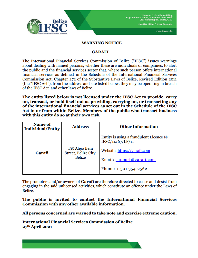 चेतावनी प्रपत्र Garafi बेलीज का अंतर्राष्ट्रीय वित्तीय सेवा आयोग ("आईएफएससी") सार्वजनिक और वित्तीय सेवा क्षेत्र को सचेत करने के लिए नामित व्यक्तियों, चाहे वे व्यक्ति हों या कंपनियां हों, के साथ व्यवहार करने के बारे में चेतावनी जारी करता है, जहां ऐसा व्यक्ति अनुसूची में परिभाषित अंतर्राष्ट्रीय वित्तीय सेवाएं प्रदान करता है। अंतर्राष्ट्रीय वित्तीय सेवा आयोग अधिनियम, बेलीज के मूल कानूनों के अध्याय 272, संशोधित संस्करण 2011 ("आईएफएससी अधिनियम"), नीचे सूचीबद्ध पते और साइट से, वे आईएफएससी अधिनियम और अन्य कानूनों के उल्लंघन में काम कर सकते हैं बेलीज। नीचे सूचीबद्ध इकाई को ifsc अधिनियम के तहत लाइसेंस प्राप्त नहीं है, प्रदान करने, जारी रखने, लेन-देन करने, या प्रदान करने, जारी रखने, या किसी भी अंतरराष्ट्रीय वित्तीय सेवाओं को प्रदान करने के रूप में खुद को रखने के लिए, जैसा कि ifsc अधिनियम की अनुसूची में या से निर्धारित किया गया है। बेलीज के भीतर। जनता के सदस्य जो इस इकाई के साथ व्यापार करते हैं, वे अपने जोखिम पर ऐसा करते हैं। व्यक्ति/संस्था का नाम पता अन्य जानकारी Garafi 135 अलेजो बेनी स्ट्रीट, बेलीज सिटी, बेलीज इकाई एक फर्जी लाइसेंस नंबर का उपयोग कर रही है: ifsc/14/67/lp/11 वेबसाइट: https:// Garafi .com ईमेल: support@ Garafi .com फोन: + 501 354-2562 के प्रमोटर और/या मालिक Garafi इसलिए उक्त बिना लाइसेंस वाली गतिविधियों में शामिल होने से रोकने और रोकने के लिए निर्देशित किया जाता है, जो कि बेलीज के कानूनों के तहत एक अपराध है। जनता को किसी अन्य उपलब्ध जानकारी के साथ अंतर्राष्ट्रीय वित्तीय सेवा आयोग से संपर्क करने के लिए आमंत्रित किया जाता है। सभी संबंधित व्यक्तियों को चेतावनी दी जाती है कि वे ध्यान दें और अत्यधिक सावधानी बरतें। बेलीज का अंतर्राष्ट्रीय वित्तीय सेवा आयोग 27 अप्रैल 2021