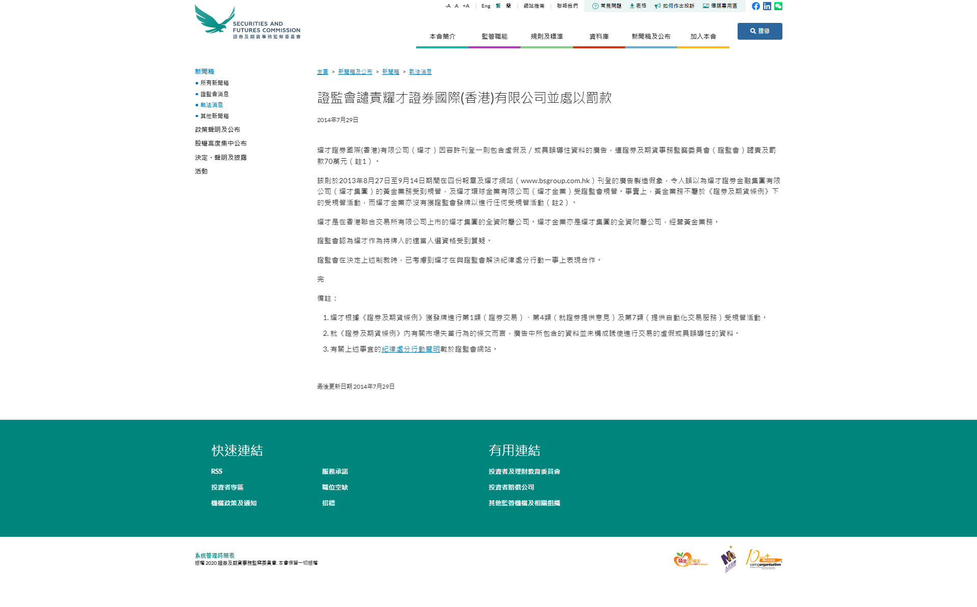एसएफसी निंदा करता है BRIGHT इंटरनेशनल (हांगकांग) कं, लिमिटेड और 29 जुलाई 2014 को जुर्माना लगाया गया BRIGHT इंटरनेशनल (हांगकांग) लिमिटेड (यीउ कै) को गलत और/या भ्रामक जानकारी वाले विज्ञापन के प्रकाशन की अनुमति देने के लिए सिक्योरिटीज एंड फ्यूचर्स कमीशन (SFC) द्वारा फटकार लगाई गई और $700,000 का जुर्माना लगाया गया (नोट 1)। 27 अगस्त से 14 सितंबर, 2013 तक चार अखबारों और ब्राइट टैलेंट की वेबसाइट (www.bsgroup.com.hk) में प्रकाशित विज्ञापन ने गलत छाप छोड़ी, जिससे लोगों को लगा कि BRIGHT फाइनेंशियल ग्रुप लिमिटेड (ग्लोरी टैलेंट ग्रुप) के सोने के कारोबार को विनियमित किया जाता है, और ब्राइट टैलेंट ग्लोबल बुलियन लिमिटेड (ग्लोरी टैलेंट गोल्ड इंडस्ट्री) को एसएफसी द्वारा नियंत्रित किया जाता है। वास्तव में, SFO के तहत सोने का कारोबार एक विनियमित गतिविधि नहीं है, और किसी भी विनियमित गतिविधियों को करने के लिए SFC द्वारा ब्राइट गोल्ड को लाइसेंस नहीं दिया जाता है (नोट 2)। ब्राइट टैलेंट ग्रुप ब्राइट टैलेंट ग्रुप की पूर्ण स्वामित्व वाली सहायक कंपनी है, जो हांगकांग लिमिटेड के स्टॉक एक्सचेंज में सूचीबद्ध है। Yaocai Gold भी Yaocai Group की पूर्ण स्वामित्व वाली सहायक कंपनी है, जो सोने के कारोबार का संचालन करती है। एसएफसी का मानना है कि एक लाइसेंसधारी के रूप में ब्राइट टैलेंट की फिटनेस और औचित्य पर सवाल उठाया गया है। उपरोक्त मंजूरी का निर्धारण करने में, एसएफसी ने एसएफसी के साथ अनुशासनात्मक कार्रवाई को हल करने में याओ कै द्वारा दिखाए गए सहयोग को ध्यान में रखा है। अंतिम नोट: ब्राइट टैलेंट को टाइप 1 (प्रतिभूतियों में व्यवहार), टाइप 4 (प्रतिभूतियों पर सलाह देना) और टाइप 7 (स्वचालित ट्रेडिंग सेवाएं प्रदान करना) विनियमित गतिविधियों को जारी रखने के लिए सिक्योरिटीज और फ्यूचर्स अध्यादेश के तहत लाइसेंस प्राप्त है। विज्ञापन में निहित जानकारी एसएफओ के बाजार कदाचार प्रावधानों के प्रयोजनों के लिए व्यवहार को प्रेरित करने के लिए झूठी या भ्रामक जानकारी नहीं है। उपरोक्त मामलों के संबंध में अनुशासनात्मक कार्रवाई का विवरण SFC की वेबसाइट पर उपलब्ध है। अंतिम बार 29 जुलाई 2014 को अपडेट किया गया