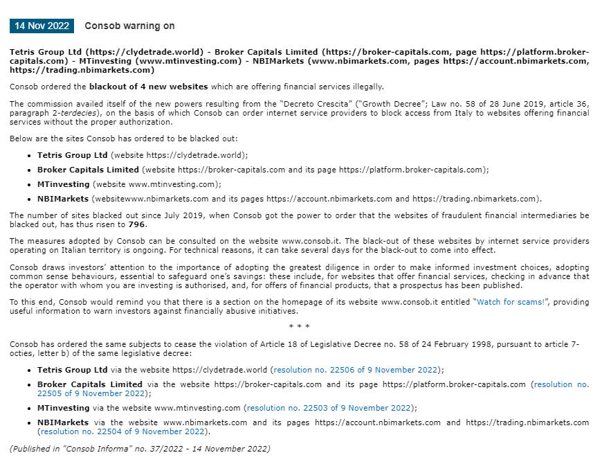 टेट्रिस ग्रुप लिमिटेड (https://clydetrade.world) पर कंसोब चेतावनी - ब्रोकर कैपिटल लिमिटेड (https://broker-capitals.com, पेज https://platform.broker-capitals.com) - MTinvesting (www.mtinvesting. com) - NBIMarkets (www.nbimarkets.com, पेज https://account.nbimarkets.com, https://trading.nbimarkets.com)