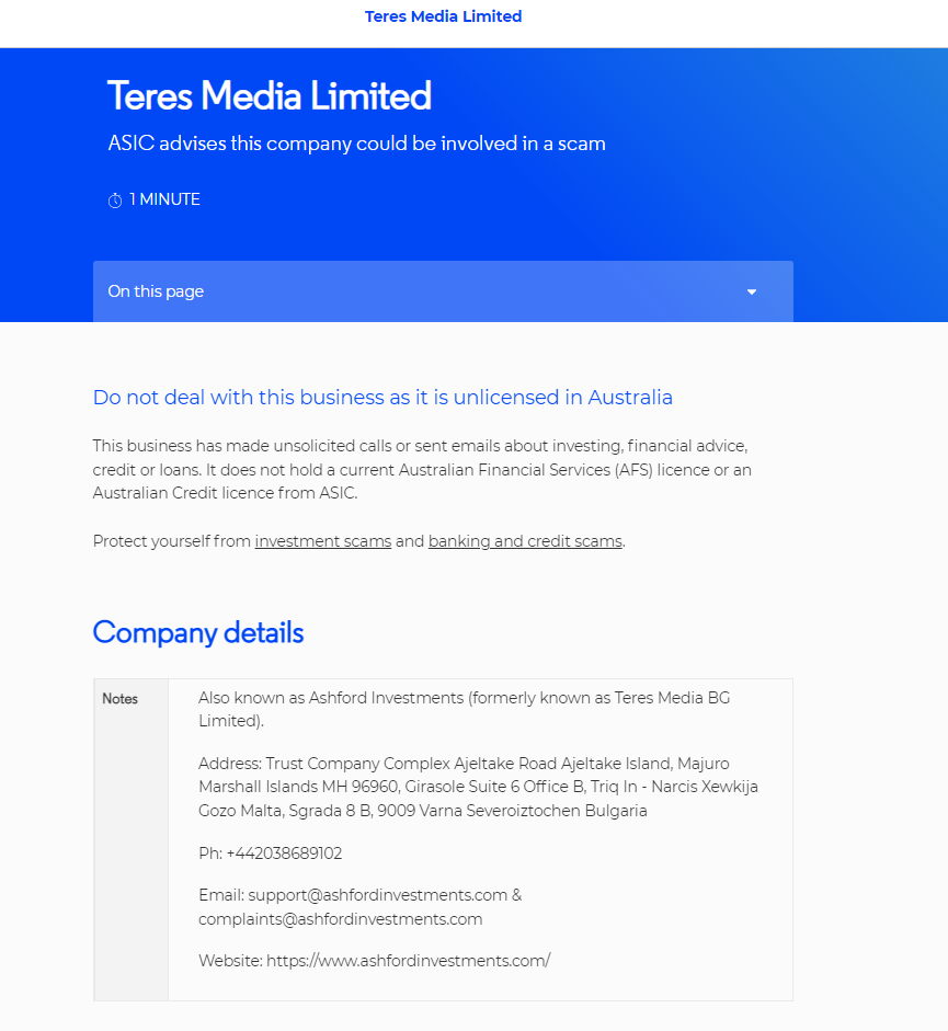 Teres Media Limitedasic की सलाह है कि यह कंपनी स्कैम पेज रीडिंग टाइम में शामिल हो सकती है: इस पेज पर 1 मिनट इस व्यवसाय से संबंधित नहीं है क्योंकि यह ऑस्ट्रेलिया में बिना लाइसेंस के है, इस व्यवसाय ने निवेश, वित्तीय सलाह, क्रेडिट या ऋण के बारे में अवांछित कॉल किए हैं या ईमेल भेजे हैं। इसके पास वर्तमान ऑस्ट्रेलियाई वित्तीय सेवा (AFS) लाइसेंस या ASIC का ऑस्ट्रेलियाई क्रेडिट लाइसेंस नहीं है। निवेश घोटालों और बैंकिंग और क्रेडिट घोटालों से खुद को बचाएं। कंपनी विवरण नोट्स को एशफोर्ड इन्वेस्टमेंट के रूप में भी जाना जाता है (जिसे पहले टेरेस मीडिया बीजी लिमिटेड के रूप में जाना जाता था)। पता: ट्रस्ट कंपनी कॉम्प्लेक्स एजेल्टेक रोड एजेल्टेक आइलैंड, माजुरो मार्शल आइलैंड्स एमएच 96960, गिरासोल सूट 6 ऑफिस बी, ट्राइक इन - नार्सिस ज़ेवकीजा गोजो माल्टा, स्ग्राडा 8 बी, 9009 वर्ना सेवरोइज़ोचेन बुल्गारिया फोन: +442038689102 ईमेल: सपोर्ट@ AshfordInvestments .com और शिकायतें@ AshfordInvestments .com वेबसाइट: https://www. AshfordInvestments .com/
