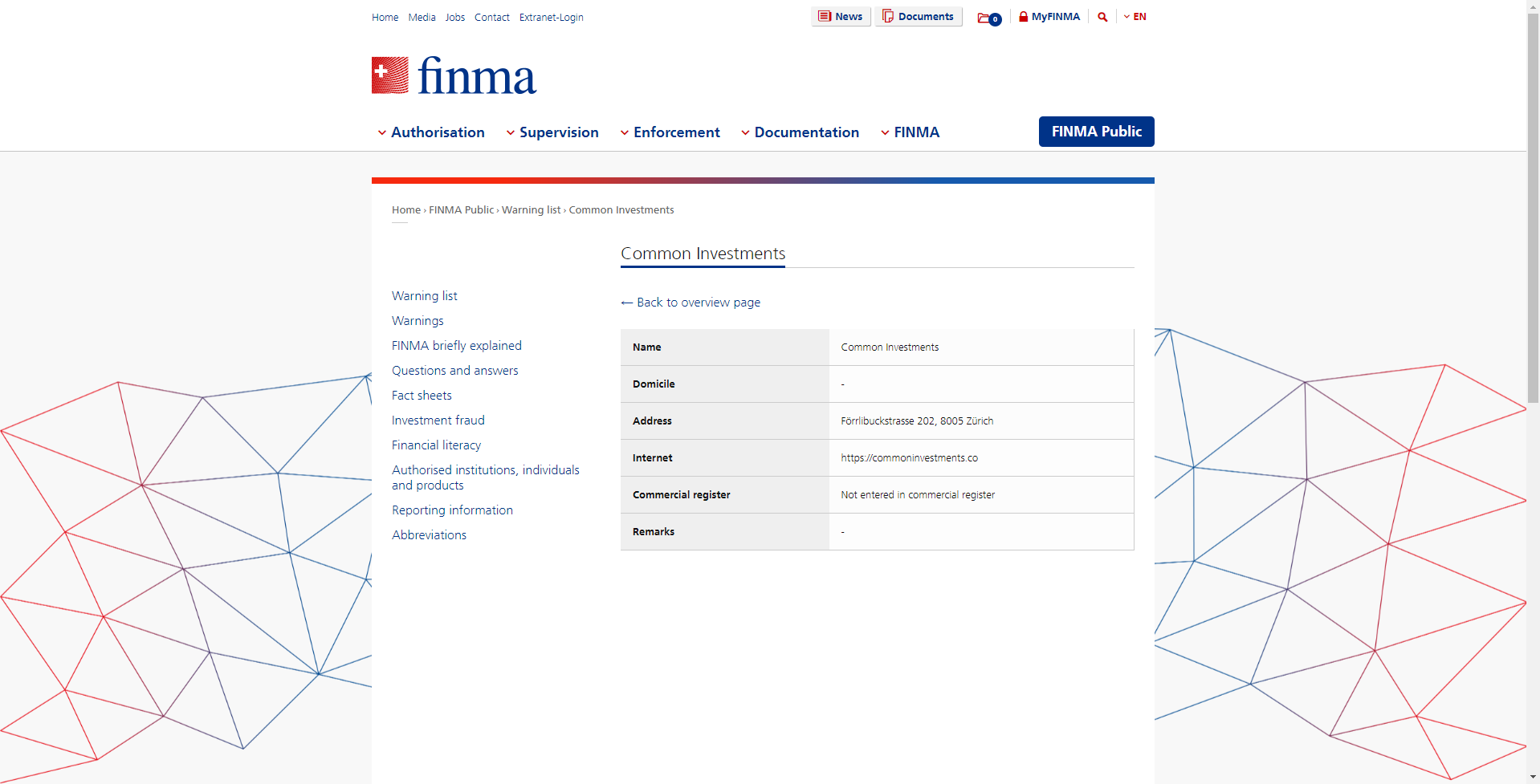Common Investmentsनाम Common Investments अधिवास - पता förrlibuckstrasse 202, 8005 ज़्यूरिख़ इंटरनेट https://commoninvestments.co वाणिज्यिक रजिस्टर वाणिज्यिक रजिस्टर टिप्पणियों में दर्ज नहीं -