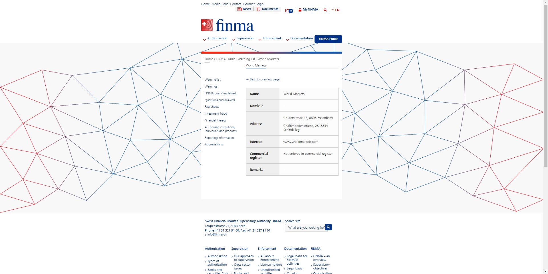 फिनमा स्विट्जरलैंड का स्वतंत्र वित्तीय बाजार नियामक है। इसका जनादेश बैंकों, बीमा कंपनियों, एक्सचेंजों, प्रतिभूति डीलरों, सामूहिक निवेश योजनाओं और उनके परिसंपत्ति प्रबंधकों और फंड प्रबंधन कंपनियों की देखरेख करना है। यह वितरकों और बीमा मध्यस्थों को भी नियंत्रित करता है। यह लेनदारों, निवेशकों और पॉलिसीधारकों की रक्षा करने के लिए चार्ज किया जाता है। फिनमा यह सुनिश्चित करने के लिए जिम्मेदार है कि स्विट्जरलैंड के वित्तीय बाजार प्रभावी रूप से कार्य करें।