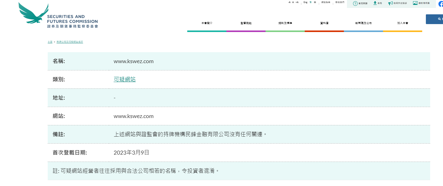 बिना लाइसेंस वाली कंपनियों और संदिग्ध वेबसाइटों की सूची उन कंपनियों को सूचीबद्ध करती है जिन्हें हांगकांग में लाइसेंस प्राप्त नहीं है और जिन्होंने प्रतिभूति और वायदा आयोग का ध्यान आकर्षित किया है। इन कंपनियों पर हांगकांग के निवेशकों के लिए विपणन करने या हांगकांग से संबंध रखने का दावा करने का संदेह है। कोई कंपनी सूची में है या नहीं यह देखने के लिए आप नाम या श्रेणी से खोज सकते हैं। यह सूची व्यापक नहीं है। हम समय-समय पर सूची में नए नाम जोड़ते हैं क्योंकि SFC अक्सर कंपनियों या नोट की वेबसाइटों को ढूंढती है। यदि किसी लाइसेंस-रहित कंपनी द्वारा आपसे संपर्क किया गया है, तो कृपया हमारे ऑनलाइन शिकायत फ़ॉर्म का उपयोग करें। बॉयलर रूम, कपटपूर्ण वेबसाइटों और फ़िशिंग ईमेल के बारे में अधिक जानकारी के लिए कृपया संबंधित लिंक पर क्लिक करें। नोट: बिना लाइसेंस वाली कंपनियों और संदिग्ध वेबसाइटों की सूची का उद्देश्य निवेशकों को जल्दी सतर्क करना है। निवेशकों को केवल उपरोक्त सूची में दी गई जानकारी पर भरोसा नहीं करना चाहिए, उन्हें व्यक्तिगत रूप से व्यक्तिगत कंपनियों के विवरणों की सावधानीपूर्वक जांच करने की आवश्यकता है। कृपया सूची देखने के लिए प्रत्येक कॉलम में सामग्री नाम के पहले अंग्रेजी अक्षर का चयन करें, या केवल चीनी नामों वाली कंपनियों को ब्राउज़ करने के लिए "चीनी नाम" कॉलम पर क्लिक करें। नाम: www.kswez.com श्रेणी: संदिग्ध वेबसाइट पता: - वेबसाइट: www.kswez.com टिप्पणी: उपरोक्त वेबसाइट का सिक्योरिटीज रेगुलेटरी कमीशन की लाइसेंस प्राप्त संस्था मिनफेंग फाइनेंशियल लिमिटेड से कोई संबंध नहीं है। पहले प्रकाशन की तिथि: 9 मार्च, 2023 नोट: संदिग्ध वेबसाइट ऑपरेटर अक्सर निवेशकों को भ्रमित करते हुए वैध कंपनियों के समान नामों का उपयोग करते हैं।
