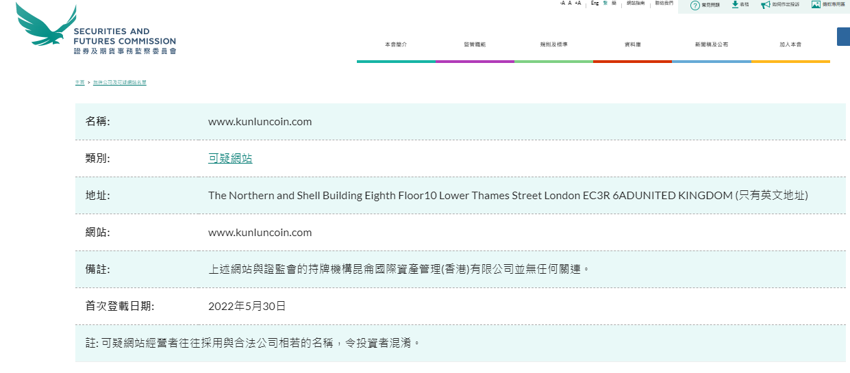 नाम: www.kunluncoin.com श्रेणी: संदिग्ध वेबसाइट पता: उत्तरी और शेल बिल्डिंग आठवीं मंजिल 10 लोअर थेम्स स्ट्रीट लंदन ec3r 6adunited किंगडम (केवल अंग्रेजी पता) वेबसाइट: www.kunluncoin.com टिप्पणी: उपरोक्त वेबसाइट एसएफसी द्वारा लाइसेंस प्राप्त नहीं है KVB Kunlun एसेट मैनेजमेंट (हांगकांग) लिमिटेड किसी भी तरह से जुड़ा नहीं है। पहले प्रकाशन की तिथि: 30 मई, 2022 नोट: संदिग्ध वेबसाइट संचालक अक्सर निवेशकों को भ्रमित करते हुए वैध कंपनियों के समान नामों का उपयोग करते हैं। "बिना लाइसेंस वाली कंपनियां और संदिग्ध वेबसाइटें उन कंपनियों को सूचीबद्ध करती हैं जिन्हें हांगकांग में लाइसेंस प्राप्त नहीं है और जिन्होंने एसएफसी का ध्यान आकर्षित किया है। इन कंपनियों पर हांगकांग के निवेशकों के लिए विपणन करने या हांगकांग से लिंक होने का दावा करने का संदेह है। आप यह देखने के लिए नाम या श्रेणी से खोज सकते हैं कि कोई कंपनी सूची में है या नहीं। यह सूची संपूर्ण नहीं है। जैसा कि SFC अक्सर कंपनियों या नोट की वेबसाइटों को ढूंढती है, नई कंपनियों को समय-समय पर सूची में जोड़ा जाता है। यदि आप बिना लाइसेंस वाली कंपनी द्वारा संपर्क किया गया, कृपया हमारे ऑनलाइन शिकायत फॉर्म का उपयोग करें। बॉयलर रूम, धोखाधड़ी वाली वेबसाइटों और फ़िशिंग ईमेल के बारे में अधिक जानकारी के लिए, कृपया संबंधित लिंक पर क्लिक करें। नोट: बिना लाइसेंस वाली कंपनियों और संदिग्ध वेबसाइटों की सूची का उद्देश्य प्रारंभिक चेतावनी जारी करना है निवेशकों के लिए। निवेशक केवल उपरोक्त सूची में दी गई जानकारी पर भरोसा नहीं कर सकते हैं, उन्हें व्यक्तिगत कंपनियों के विवरण की सावधानीपूर्वक जांच करने की आवश्यकता है। कृपया सूची देखने के लिए प्रत्येक कॉलम के नाम के पहले अंग्रेजी अक्षर का चयन करें, या "चीनी नाम" पर क्लिक करें। कॉलम केवल चीनी नामों वाली कंपनियों को ब्राउज़ करता है।"
