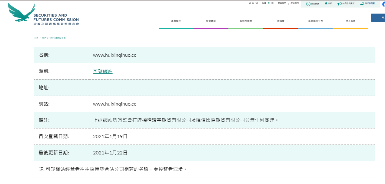 नाम: www.huixinqihuo.cc श्रेणी: संदिग्ध वेबसाइट पता: - वेबसाइट: www.huixinqihuo.cc टिप्पणी: उपरोक्त वेबसाइट का Huanyu Futures Co., Ltd. और Huixin International Futures Co., Ltd. से कोई संबंध नहीं है, जो लाइसेंस प्राप्त हैं चीन प्रतिभूति नियामक आयोग द्वारा। पहली प्रकाशित तिथि: 19 जनवरी, 2021 अंतिम अद्यतन तिथि: 22 जनवरी, 2021 नोट: संदिग्ध वेबसाइट संचालक अक्सर निवेशकों को भ्रमित करने के लिए वैध कंपनियों के समान नामों का उपयोग करते हैं। "बिना लाइसेंस वाली कंपनियां और संदिग्ध वेबसाइटें उन कंपनियों को सूचीबद्ध करती हैं जिन्हें हांगकांग में लाइसेंस प्राप्त नहीं है और जिन्होंने एसएफसी का ध्यान आकर्षित किया है। इन कंपनियों पर हांगकांग के निवेशकों के लिए विपणन करने या हांगकांग से लिंक होने का दावा करने का संदेह है। आप यह देखने के लिए नाम या श्रेणी से खोज सकते हैं कि कोई कंपनी सूची में है या नहीं। यह सूची संपूर्ण नहीं है। जैसा कि SFC अक्सर कंपनियों या नोट की वेबसाइटों को ढूंढती है, नई कंपनियों को समय-समय पर सूची में जोड़ा जाता है। यदि आप बिना लाइसेंस वाली कंपनी द्वारा संपर्क किया गया, कृपया हमारे ऑनलाइन शिकायत फॉर्म का उपयोग करें। बॉयलर रूम, धोखाधड़ी वाली वेबसाइटों और फ़िशिंग ईमेल के बारे में अधिक जानकारी के लिए, कृपया संबंधित लिंक पर क्लिक करें। नोट: बिना लाइसेंस वाली कंपनियों और संदिग्ध वेबसाइटों की सूची का उद्देश्य पूर्व चेतावनी जारी करना है निवेशकों के लिए। निवेशक केवल उपरोक्त सूची में दी गई जानकारी पर भरोसा नहीं कर सकते हैं, उन्हें व्यक्तिगत कंपनियों के विवरण की सावधानीपूर्वक जांच करने की आवश्यकता है। कृपया सूची देखने के लिए प्रत्येक कॉलम के नाम के पहले अंग्रेजी अक्षर का चयन करें, या "चीनी नाम" पर क्लिक करें। कॉलम केवल चीनी नामों वाली कंपनियों को ब्राउज़ करता है।"