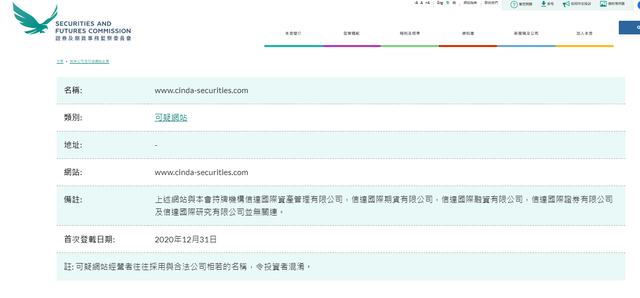 नाम: www.cinda-securities.com श्रेणी: संदिग्ध वेबसाइट का पता: - वेबसाइट: www.cinda-securities.com टिप्पणी: उपरोक्त वेबसाइट Cinda International Asset Management Co., Ltd., Cinda International Futures Co. से संबंधित नहीं है। Ltd., Cinda International Cinda Capital Limited, Cinda International Securities Limited और Cinda International Research Limited जुड़े नहीं हैं। पहले प्रकाशन की तिथि: 31 दिसंबर, 2020 नोट: संदिग्ध वेबसाइट संचालक अक्सर निवेशकों को भ्रमित करते हुए वैध कंपनियों के समान नामों का उपयोग करते हैं। "बिना लाइसेंस वाली कंपनियां और संदिग्ध वेबसाइटें उन कंपनियों को सूचीबद्ध करती हैं जिन्हें हांगकांग में लाइसेंस प्राप्त नहीं है और जिन्होंने एसएफसी का ध्यान आकर्षित किया है। इन कंपनियों पर हांगकांग के निवेशकों के लिए विपणन करने या हांगकांग से लिंक होने का दावा करने का संदेह है। आप यह देखने के लिए नाम या श्रेणी से खोज सकते हैं कि कोई कंपनी सूची में है या नहीं। यह सूची संपूर्ण नहीं है। जैसा कि SFC अक्सर कंपनियों या नोट की वेबसाइटों को ढूंढती है, नई कंपनियों को समय-समय पर सूची में जोड़ा जाता है। यदि आप बिना लाइसेंस वाली कंपनी द्वारा संपर्क किया गया, कृपया हमारे ऑनलाइन शिकायत फॉर्म का उपयोग करें। बॉयलर रूम, धोखाधड़ी वाली वेबसाइटों और फ़िशिंग ईमेल के बारे में अधिक जानकारी के लिए, कृपया संबंधित लिंक पर क्लिक करें। नोट: बिना लाइसेंस वाली कंपनियों और संदिग्ध वेबसाइटों की सूची का उद्देश्य पूर्व चेतावनी जारी करना है निवेशकों के लिए। निवेशक केवल उपरोक्त सूची में दी गई जानकारी पर भरोसा नहीं कर सकते हैं, उन्हें व्यक्तिगत कंपनियों के विवरण की सावधानीपूर्वक जांच करने की आवश्यकता है। कृपया सूची देखने के लिए प्रत्येक कॉलम के नाम के पहले अंग्रेजी अक्षर का चयन करें, या "चीनी नाम" पर क्लिक करें। कॉलम केवल चीनी नामों वाली कंपनियों को ब्राउज़ करता है।"