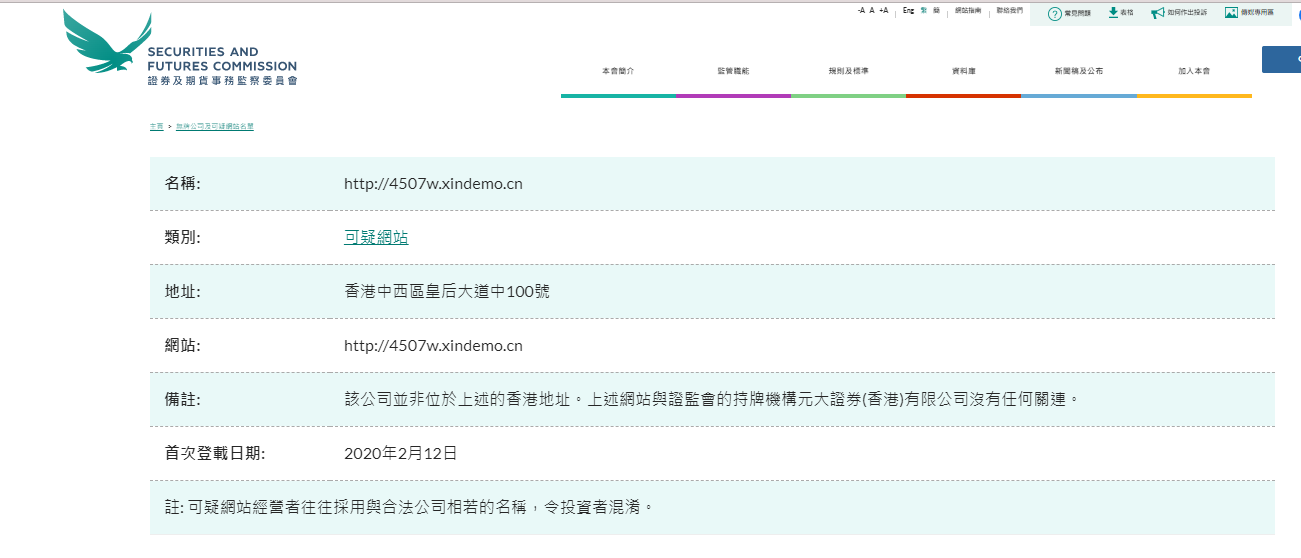 नाम: http://4507w.xindemo.cn श्रेणी: संदिग्ध वेबसाइट पता: 100 क्वींस रोड सेंट्रल, सेंट्रल और वेस्टर्न डिस्ट्रिक्ट, हांगकांग वेबसाइट: http://4507w.xindemo.cn नोट: कंपनी ऊपर स्थित नहीं है हांगकांग का पता। उपरोक्त वेबसाइट का Yuanta Securities (Hong Kong) Co., Ltd. से कोई संबंध नहीं है, जिसे SFC द्वारा लाइसेंस दिया गया है। पहले प्रकाशन की तिथि: 12 फरवरी, 2020 नोट: संदिग्ध वेबसाइट संचालक अक्सर निवेशकों को भ्रमित करते हुए वैध कंपनियों के समान नामों का उपयोग करते हैं। "बिना लाइसेंस वाली कंपनियां और संदिग्ध वेबसाइटें उन कंपनियों को सूचीबद्ध करती हैं जिन्हें हांगकांग में लाइसेंस प्राप्त नहीं है और जिन्होंने एसएफसी का ध्यान आकर्षित किया है। इन कंपनियों पर हांगकांग के निवेशकों के लिए विपणन करने या हांगकांग से लिंक होने का दावा करने का संदेह है। आप यह देखने के लिए नाम या श्रेणी से खोज सकते हैं कि कोई कंपनी सूची में है या नहीं। यह सूची संपूर्ण नहीं है। जैसा कि SFC अक्सर कंपनियों या नोट की वेबसाइटों को ढूंढती है, नई कंपनियों को समय-समय पर सूची में जोड़ा जाता है। यदि आप बिना लाइसेंस वाली कंपनी द्वारा संपर्क किया गया, कृपया हमारे ऑनलाइन शिकायत फॉर्म का उपयोग करें। बॉयलर रूम, धोखाधड़ी वाली वेबसाइटों और फ़िशिंग ईमेल के बारे में अधिक जानकारी के लिए, कृपया संबंधित लिंक पर क्लिक करें। नोट: बिना लाइसेंस वाली कंपनियों और संदिग्ध वेबसाइटों की सूची का उद्देश्य पूर्व चेतावनी जारी करना है निवेशकों के लिए। निवेशक केवल उपरोक्त सूची में दी गई जानकारी पर भरोसा नहीं कर सकते हैं, उन्हें व्यक्तिगत कंपनियों के विवरण की सावधानीपूर्वक जांच करने की आवश्यकता है। कृपया सूची देखने के लिए प्रत्येक कॉलम के नाम के पहले अंग्रेजी अक्षर का चयन करें, या "चीनी नाम" पर क्लिक करें। कॉलम केवल चीनी नामों वाली कंपनियों को ब्राउज़ करता है।"