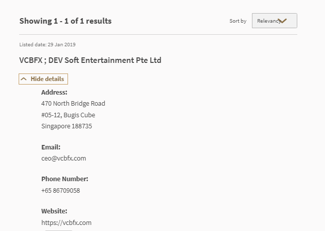"निवेशक अलर्ट सूची निवेशक अलर्ट सूची उन व्यक्तियों की एक सूची प्रदान करती है, जो एमएएस को उपलब्ध जानकारी के आधार पर, i) गलत तरीके से लाइसेंस प्राप्त होने या किसी अन्य तरीके से एमएएस द्वारा अधिकृत या विनियमित होने के रूप में माना जा सकता है या हो सकता है; ii) बनाया है व्यापारिक न्यास या सामूहिक निवेश योजना में इकाइयों की पेशकश जिसे एमएएस द्वारा अधिकृत, मान्यता प्राप्त या पंजीकृत होने के रूप में गलत तरीके से माना जा सकता है या हो सकता है; iii) निवेश की पेशकश की है जिसे गलत तरीके से माना जा सकता है या हो सकता है एमएएस के साथ दर्ज या पंजीकृत एक दस्तावेज के साथ या उसके साथ। यह सूची संपूर्ण नहीं है और प्रकाशन के समय एमएएस को जो ज्ञात था, उस पर आधारित है। सूचीबद्ध तिथि: 29 जनवरी 2019 वीसीबीएफएक्स; DEV सॉफ्ट एंटरटेनमेंट पीटीई लिमिटेड विवरण छुपाएं पता: 470 नॉर्थ ब्रिज रोड #05-12, बुगिस क्यूब सिंगापुर 188735 ईमेल: ceo@vcbfx.com फोन नंबर: +65 86709058 वेबसाइट: https://vcbfx.com