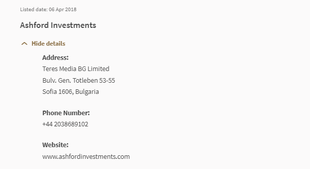 "निवेशक अलर्ट सूची निवेशक अलर्ट सूची उन लोगों की सूची प्रदान करती है, जो मास को उपलब्ध जानकारी के आधार पर, i) गलत तरीके से लाइसेंस प्राप्त होने या किसी अन्य तरीके से मास द्वारा अधिकृत या विनियमित होने के रूप में माना जा सकता है या हो सकता है; ii) बनाया है व्यापारिक न्यास या सामूहिक निवेश योजना में यूनिटों का प्रस्ताव जिसे मास द्वारा प्राधिकृत, मान्यता प्राप्त या पंजीकृत होने के रूप में गलत तरीके से समझा जा सकता है या माना जा सकता है; iii) निवेश का प्रस्ताव दिया है जिसे गलत तरीके से माना जा सकता है या हो सकता है मास में दर्ज या पंजीकृत किसी दस्तावेज़ के साथ या उसके साथ। यह सूची संपूर्ण नहीं है और प्रकाशन के समय मास को जो ज्ञात था, उस पर आधारित है। सूचीबद्ध तिथि: 06 अप्रैल 2018 एशफोर्ड निवेश विवरण छुपाएं पता: टेरेस मीडिया बीजी लिमिटेड बुलव। जनरल। टोटलबेन 53-55 सोफिया 1606, बुल्गारिया फोन नंबर: +44 2038689102 वेबसाइट: www. AshfordInvestments .com