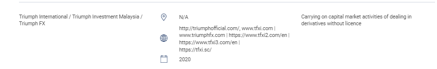 "इस खंड में अनधिकृत वेबसाइटों, निवेश उत्पादों, कंपनियों और व्यक्तियों की सूची शामिल है। इस सूची में शामिल हैं: अनुसूचित जाति से लाइसेंस के बिना निम्नलिखित विनियमित गतिविधियों को करने वाले व्यक्ति: प्रतिभूतियों में व्यवहार करना; डेरिवेटिव में व्यवहार करना; निधि प्रबंधन; कॉर्पोरेट वित्त पर सलाह देना; निवेश सलाह; वित्तीय योजना; और निजी सेवानिवृत्ति योजनाओं में काम करना। प्राधिकरण के बिना एक मान्यता प्राप्त बाजार का संचालन करने वाले व्यक्ति। अनुमोदन, प्राधिकरण या मान्यता के बिना प्रतिभूतियों को जारी करने या पेश करने वाले व्यक्ति। अनुसूचित जाति के लोगो का दुरुपयोग करने वाले व्यक्ति और अनुसूचित जाति को गलत तरीके से प्रस्तुत करना। "ट्रांयफ इंटरनेशनल / ट्राइंफ इन्वेस्टमेंट मलेशिया / Triumph FX n/a http://triumphofficial.com/, www.tfxi.com | www। TriumphFX .com | https://www.tfxi2.com/en | https://www.tfxi3.com/en | https://tfxi.sc/ 2020 बिना लाइसेंस के डेरिवेटिव्स में डील करने की पूंजी बाजार गतिविधियों को संचालित करना
