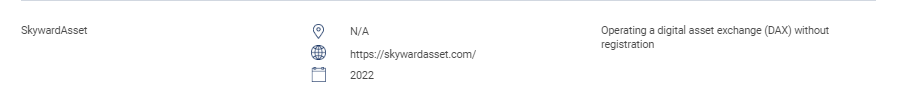 "इस अनुभाग में अनधिकृत वेबसाइटों, निवेश उत्पादों, कंपनियों और व्यक्तियों की सूची शामिल है। इस सूची में शामिल हैं: एससी से लाइसेंस के बिना निम्नलिखित विनियमित गतिविधियों को चलाने वाले या खुद को बाहर रखने वाले व्यक्ति: प्रतिभूतियों में लेनदेन; डेरिवेटिव में लेनदेन; फंड प्रबंधन; कॉर्पोरेट वित्त पर सलाह देना; निवेश सलाह; वित्तीय योजना; और निजी सेवानिवृत्ति योजनाओं में काम करना। प्राधिकरण के बिना मान्यता प्राप्त बाजार का संचालन करने वाले व्यक्ति। अनुमोदन, प्राधिकरण या मान्यता के बिना प्रतिभूतियां जारी करने या पेश करने वाले व्यक्ति। एससी के लोगो का दुरुपयोग करने वाले और एससी को गलत तरीके से प्रस्तुत करने वाले व्यक्ति। " स्काईवर्डएसेट एन/ए https://skywardasset.com/ 2022 बिना पंजीकरण के डिजिटल एसेट एक्सचेंज (DAX) का संचालन