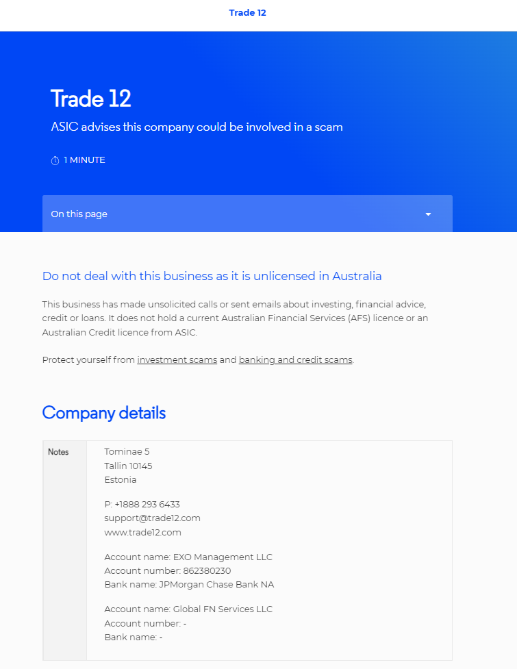 निवेशक चेतावनी सूची ट्रेड 12 ASIC सलाह देता है कि यह कंपनी एक घोटाले में शामिल हो सकती है.