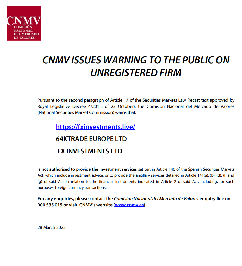 निवेशक चेतावनी - 64KTRADE यूरोप लिमिटेड; एफएक्स निवेश लिमिटेड.