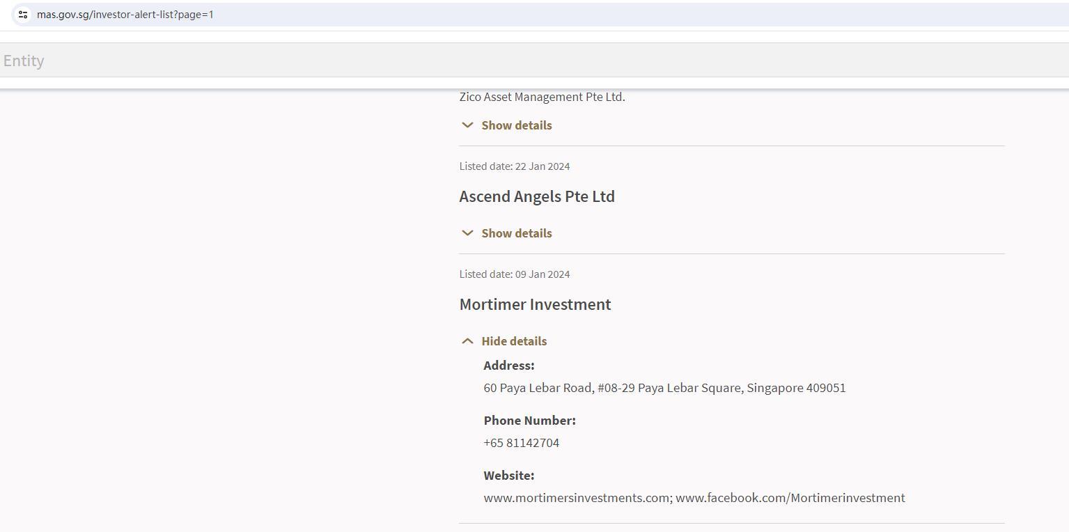 "निवेशक चेतावनी सूची निवेशक चेतावनी सूची उन व्यक्तियों की एक सूची प्रदान करती है, जो एमएएस के पास उपलब्ध जानकारी के आधार पर, i) गलत तरीके से लाइसेंस प्राप्त या किसी अन्य तरीके से एमएएस द्वारा अधिकृत या विनियमित माना जा सकता है; ii) बनाया है किसी व्यावसायिक ट्रस्ट या सामूहिक निवेश योजना में इकाइयों की पेशकश जिसे मास द्वारा अधिकृत, मान्यता प्राप्त या पंजीकृत माना जा सकता है या गलत तरीके से माना जा सकता है; iii) निवेश की पेशकश की है जिसे गलत तरीके से माना जा सकता है या किया जा सकता है एमएएस के साथ दर्ज या पंजीकृत दस्तावेज़ में बनाया गया या उसके साथ। यह सूची संपूर्ण नहीं है और प्रकाशन के समय एमएएस को जो जानकारी थी उस पर आधारित है।" सूचीबद्ध तिथि: 09 जनवरी 2024 Mortimer Investment विवरण छुपाएं पता: 60 पाया लेबर रोड, #08-29 पाया लेबर स्क्वायर, सिंगापुर 409051 फोन नंबर: +65 81142704 वेबसाइट: www.mortimersinvestments.com; www.facebook.com/mortimerinvestment