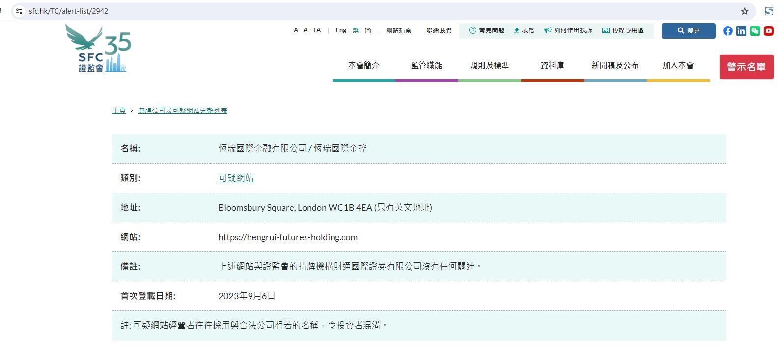 बिना लाइसेंस वाली कंपनियों और संदिग्ध वेबसाइटों की सूची में उन कंपनियों को सूचीबद्ध किया गया है जिनके पास हांगकांग में लाइसेंस नहीं है और जिन्होंने एसएफसी का ध्यान आकर्षित किया है। संदेह है कि ये कंपनियाँ वर्तमान में या तो हांगकांग के निवेशकों को निशाना बना रही हैं, या हांगकांग से संबंध रखने का दावा कर रही हैं। आप यह जांचने के लिए नाम या श्रेणी से खोज सकते हैं कि कोई कंपनी सूची में शामिल है या नहीं। यह सूची व्यापक नहीं है। चूंकि प्रतिभूति और वायदा आयोग अक्सर ध्यान देने योग्य कंपनियों या वेबसाइटों की खोज करता है, हम समय-समय पर सूची में नए नाम जोड़ेंगे। यदि किसी बिना लाइसेंस वाली कंपनी ने आपसे संपर्क किया है, तो कृपया हमारे ऑनलाइन शिकायत फ़ॉर्म का उपयोग करें। बॉयलर रूम, धोखाधड़ी वाली वेबसाइटों और फर्जी ईमेल के बारे में अधिक जानकारी के लिए कृपया संबंधित लिंक पर क्लिक करें। नोट: बिना लाइसेंस वाली कंपनियों और संदिग्ध वेबसाइटों की सूची का उद्देश्य निवेशकों को यथाशीघ्र सचेत करना है। निवेशकों को केवल उपरोक्त सूची की जानकारी पर भरोसा नहीं करना चाहिए और स्वयं व्यक्तिगत कंपनियों के विवरण की सावधानीपूर्वक जांच करनी चाहिए। कृपया सूची देखने के लिए प्रत्येक कॉलम में नाम का पहला अंग्रेजी अक्षर चुनें, या केवल चीनी नाम वाली कंपनियों को देखने के लिए "चीनी नाम" कॉलम पर क्लिक करें। "नाम: हेनग्रुई इंटरनेशनल फाइनेंस कंपनी लिमिटेड/ HENG-RUI INTERNATIONAL FINANCIAL श्रेणी: संदिग्ध वेबसाइट पता: ब्लूम्सबरी स्क्वायर, लंदन wc1b 4ea (केवल अंग्रेजी पता) वेबसाइट: https://hengrui-futures-होल्डिंग.com नोट: उपरोक्त वेबसाइट का लाइसेंस प्राप्त Caitong International Securities Co., Ltd. से कोई संबंध नहीं है प्रतिभूति और वायदा आयोग की संस्था. पहली बार प्रकाशित होने की तिथि: 6 सितंबर, 2023 नोट: संदिग्ध वेबसाइट संचालक अक्सर निवेशकों को भ्रमित करने के लिए वैध कंपनियों के समान नामों का उपयोग करते हैं।