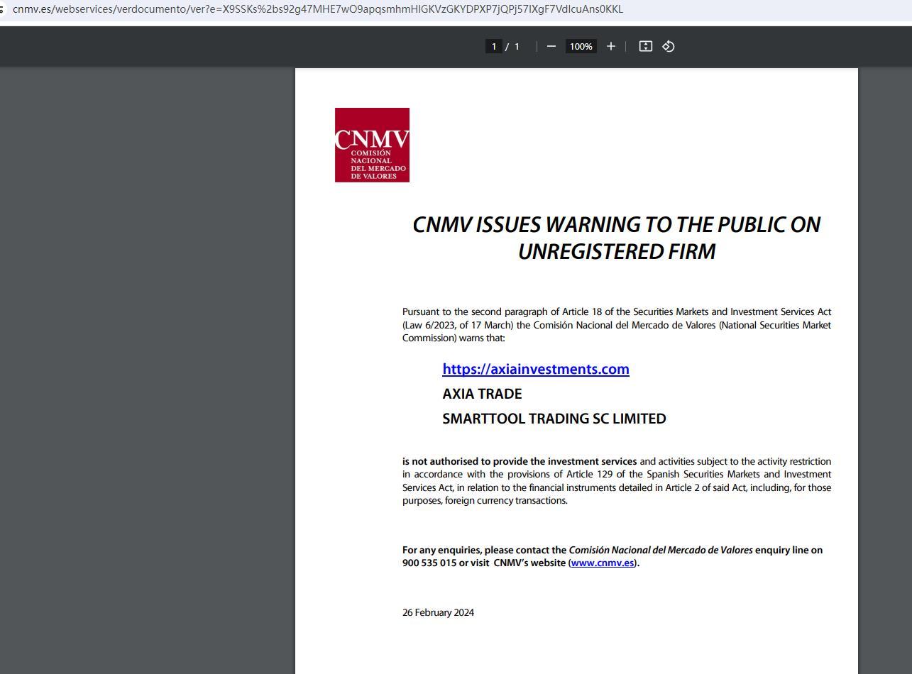 सीएनएमवी प्रतिभूति बाजार और निवेश सेवा अधिनियम (17 मार्च के कानून 6/2023) के अनुच्छेद 18 के दूसरे पैराग्राफ के अनुसार अपंजीकृत फर्म पर जनता को चेतावनी जारी करता है, कॉमिसियन नैशनल डेल मर्काडो डी वैलोरेस (राष्ट्रीय प्रतिभूति बाजार आयोग) ने चेतावनी दी है कि : https://axiainvestments.com एक्सिया ट्रेड Smarttool Trading SC Limited स्पैनिश प्रतिभूति बाजार और निवेश सेवा अधिनियम के अनुच्छेद 129 के प्रावधानों के अनुसार, उक्त अधिनियम के अनुच्छेद 2 में विस्तृत वित्तीय साधनों के संबंध में, गतिविधि प्रतिबंध के अधीन निवेश सेवाएं और गतिविधियां प्रदान करने के लिए अधिकृत नहीं है। वे उद्देश्य, विदेशी मुद्रा लेनदेन। किसी भी पूछताछ के लिए, कृपया 900 535 015 पर कॉमिसियोन नैशनल डेल मर्काडो डी वैलोरेस पूछताछ लाइन से संपर्क करें या सीएनएमवी की वेबसाइट (www.cnmv.es) पर जाएं। 26 फरवरी 2024