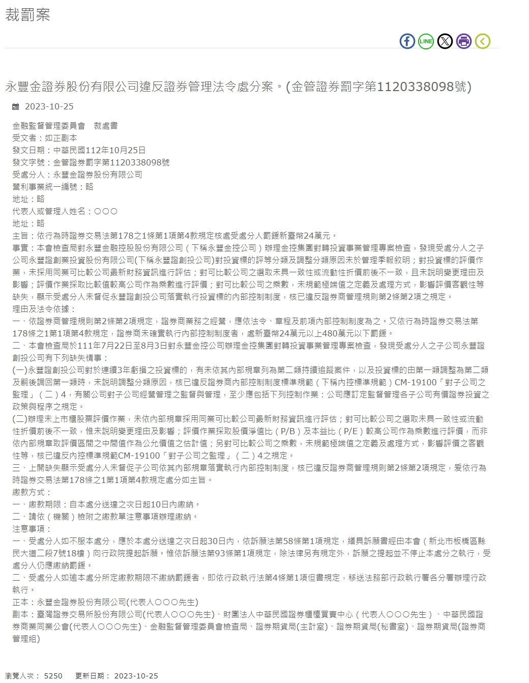 वित्तीय नियामक आयोग मंजूरी देने वाला व्यक्ति प्राप्तकर्ता: मूल प्रति जारी करने की तारीख: 25 अक्टूबर 2012 जारी करने की संख्या: वित्तीय प्रबंधन प्रतिभूति जुर्माना संख्या 1120338098 दंडित व्यक्ति: सिनोपैक सिक्योरिटीज कं, लिमिटेड लाभ चाहने वाले उद्यमों की एकीकृत संख्या: पता: प्रतिनिधि का नाम या प्रबंधक: ○○○ पता: उद्देश्य: अधिनियम के समय प्रतिभूति और विनिमय अधिनियम के अनुच्छेद 178-1, अनुच्छेद 1, अनुच्छेद 4 के प्रावधानों के अनुसार, दंडित होने वाले व्यक्ति पर NT$240,000 का जुर्माना लगाया जाएगा। तथ्य: इस आयोग के निरीक्षण ब्यूरो ने सिनो-फंग फाइनेंशियल होल्डिंग्स कंपनी लिमिटेड (इसके बाद सिनो-फंग फाइनेंशियल होल्डिंग्स के रूप में संदर्भित) के वित्तीय होल्डिंग समूह के पुनर्निवेश प्रबंधन परियोजना पर एक निरीक्षण किया और पाया कि व्यक्ति की सहायक कंपनी दंडित, सिनो-फेंग सिक्योरिटीज वेंचर कैपिटल कंपनी लिमिटेड (निवेश लक्ष्यों की रेटिंग वर्गीकरण और सिनोपैक वेंचर कैपिटल कंपनी लिमिटेड (इसके बाद सिनोपैक के रूप में संदर्भित) द्वारा वर्गीकरण के समायोजन के कारणों को प्रबंधन त्रैमासिक में नहीं बताया गया है रिपोर्ट; एक ही उद्योग में तुलनीय कंपनियों की नवीनतम वित्तीय जानकारी का उपयोग निवेश लक्ष्यों के मूल्यांकन के लिए नहीं किया जाता है; तुलनीय कंपनियों का चयन कोई स्थिरता नहीं है या तरलता छूट असंगत है, और परिवर्तन का कारण और प्रभाव स्पष्ट नहीं किया गया है ; मूल्यांकन ऑपरेशन उच्च तुलनात्मक मूल्यों वाली कंपनियों को मूल्यांकन के लिए गुणक के रूप में उपयोग करता है; तुलनीय कंपनियों के गुणकों के लिए, चरम मूल्यों की परिभाषा और उपचार को मानकीकृत नहीं किया जाता है, जो मूल्यांकन की निष्पक्षता और अन्य कमियों को प्रभावित करता है, जिससे पता चलता है कि दंडित किया जा रहा व्यक्ति निवेश लक्ष्य की आंतरिक नियंत्रण प्रणाली को लागू करने के लिए सिनोपैक वेंचर कैपिटल कंपनी से आग्रह करने में विफल रहा, और सिक्योरिटीज डीलर्स प्रबंधन नियमों के अनुच्छेद 2, आइटम 2 के प्रावधानों का उल्लंघन किया। कारण और कानूनी आधार: 1. प्रतिभूति डीलर प्रबंधन नियमों के अनुच्छेद 2, पैराग्राफ 2 के अनुसार, प्रतिभूति फर्म का व्यवसाय कानूनों, एसोसिएशन के लेखों और पिछले पैराग्राफ में निर्दिष्ट आंतरिक नियंत्रण प्रणाली के अनुसार संचालित किया जाएगा। इसके अलावा, अधिनियम के समय प्रतिभूति और विनिमय अधिनियम के अनुच्छेद 178-1, अनुच्छेद 1, अनुच्छेद 4 के अनुसार, एक प्रतिभूति फर्म जो आंतरिक नियंत्रण प्रणाली को लागू करने में विफल रहती है, उस पर कम से कम NT$240,000 का जुर्माना लगाया जाएगा, लेकिन अधिक नहीं। NT$4.8 मिलियन से अधिक। 2. 22 जुलाई से 3 अगस्त 2011 तक, इस आयोग के निरीक्षण ब्यूरो ने सिनो-फेंग