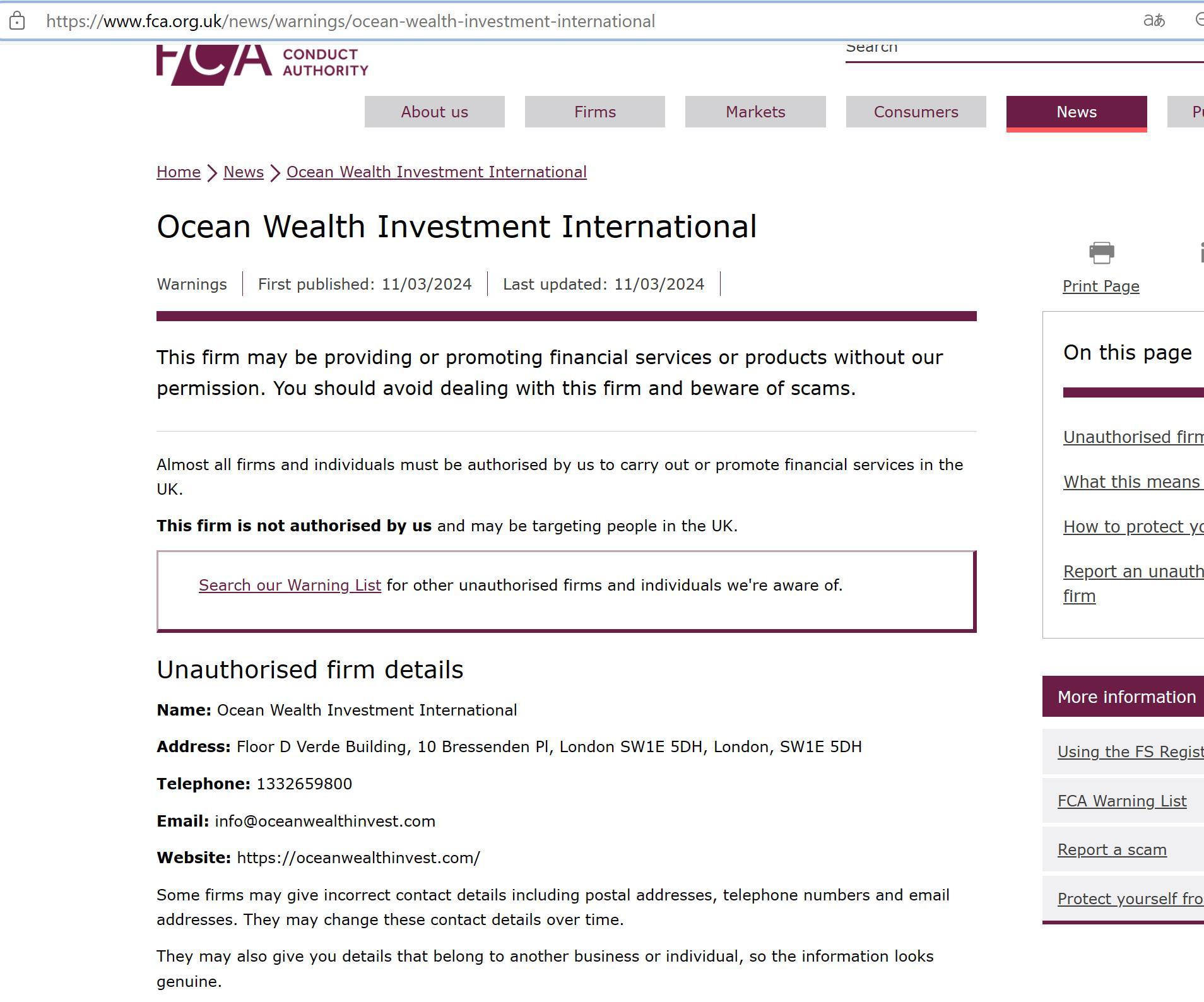 एफसीए की अनधिकृत फर्मों की चेतावनी सूची ओशन वेल्थ इन्वेस्टमेंट इंटरनेशनल.