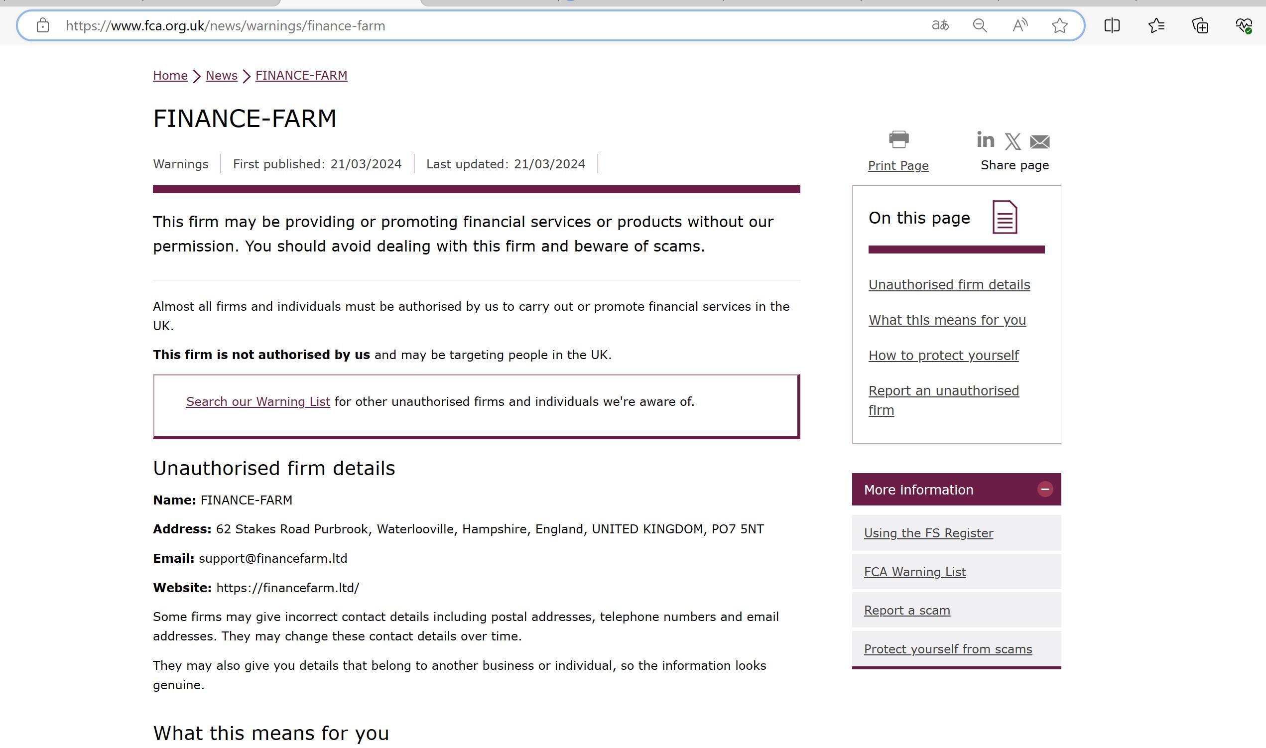 एफसीए चेतावनी सूची अनधिकृत फर्मों की वित्त-फार्म.