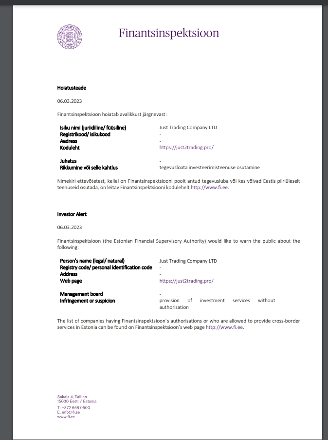 चेतावनी संदेश 06.03.2023 वित्तीय निरीक्षणालय जनता को निम्नलिखित के बारे में चेतावनी देता है: व्यक्ति का नाम (कानूनी/भौतिक) Just Trading Company लिमिटेड रजिस्ट्री कोड/व्यक्तिगत पहचान संख्या - पता - वेबसाइट https://just2trading.pro/ निदेशक मंडल - ऑपरेटिंग लाइसेंस के बिना निवेश सेवाओं के प्रावधान का उल्लंघन या संदेह उन कंपनियों की सूची जिनके पास वित्तीय पर्यवेक्षण प्राधिकरण द्वारा प्रदत्त ऑपरेटिंग लाइसेंस है या जो एस्टोनिया में सीमा पार सेवाएं प्रदान कर सकता है उसे वित्तीय पर्यवेक्षण प्राधिकरण की वेबसाइट http://www.fi.ee पर पाया जा सकता है। निवेशक चेतावनी 06.03.2023 वित्तीय पर्यवेक्षी प्राधिकरण (एस्टोनियाई वित्तीय पर्यवेक्षी प्राधिकरण) जनता को निम्नलिखित के बारे में चेतावनी देना चाहता है: व्यक्ति का नाम (कानूनी/प्राकृतिक) Just Trading Company लिमिटेड रजिस्ट्री कोड/व्यक्तिगत पहचान कोड - पता - वेब पेज https://just2trading.pro/ प्रबंधन बोर्ड - प्राधिकरण के बिना निवेश सेवाओं का उल्लंघन या संदेह प्रावधान, वित्तीय पर्यवेक्षण के प्राधिकरण वाली कंपनियों की सूची या जिन्हें सीमा पार सेवाएं प्रदान करने की अनुमति है एस्टोनिया में वित्तीय पर्यवेक्षण प्राधिकरण के वेब पेज http://www.fi.ee पर पाया जा सकता है।