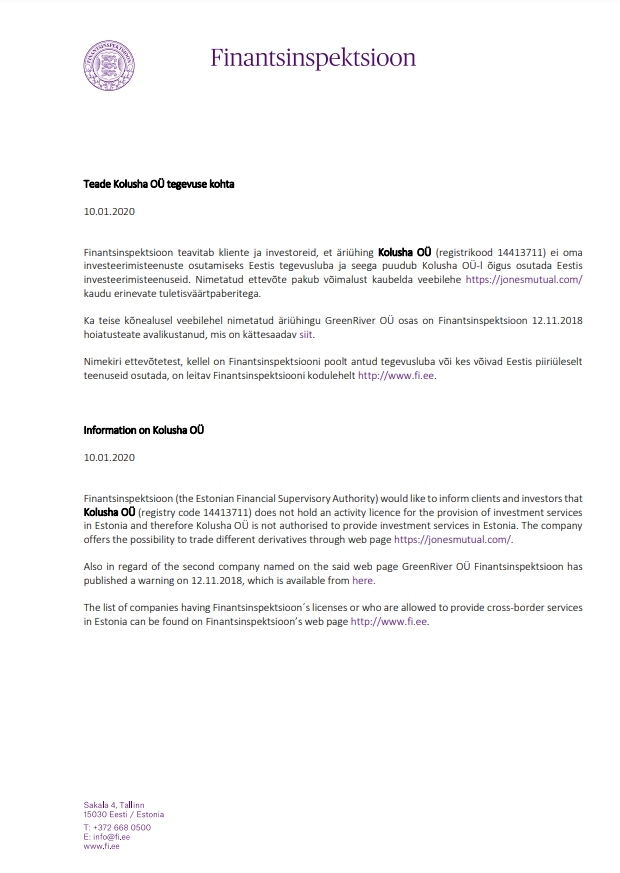 कोलुशा OÜ की गतिविधियों पर नोटिस 10.01.2020 वित्तीय पर्यवेक्षण प्राधिकरण ग्राहकों और निवेशकों को सूचित करता है कि कंपनी कोलुशा OÜ (पंजीकरण कोड 14413711) के पास एस्टोनिया में निवेश सेवाएं प्रदान करने के लिए गतिविधि लाइसेंस नहीं है और इसलिए कोलुशा OÜ के पास इसका अधिकार नहीं है। एस्टोनिया में निवेश सेवाएँ प्रदान करें। उल्लिखित कंपनी वेबसाइट https://jonesmutual.com/ के माध्यम से विभिन्न डेरिवेटिव में व्यापार करने की संभावना प्रदान करती है। प्रश्न में वेबसाइट पर उल्लिखित अन्य कंपनी ग्रीनरिवर OÜ के संबंध में, वित्तीय पर्यवेक्षण प्राधिकरण ने 12.11.2018 को एक चेतावनी नोटिस भी प्रकाशित किया है, जो यहां उपलब्ध है। उन कंपनियों की सूची जिनके पास वित्तीय पर्यवेक्षण प्राधिकरण द्वारा जारी ऑपरेटिंग लाइसेंस है या जो एस्टोनिया में सीमाओं के पार सेवाएं प्रदान कर सकती हैं, वित्तीय पर्यवेक्षण प्राधिकरण की वेबसाइट http://www.fi.ee पर पाई जा सकती हैं। कोलुशा OÜ 10.01.2020 पर जानकारी फिनेंट्सइंस्पेक्टसियोन (एस्टोनियाई वित्तीय पर्यवेक्षी प्राधिकरण) ग्राहकों और निवेशकों को सूचित करना चाहता है कि कोलुशा OÜ (रजिस्ट्री कोड 14413711) के पास एस्टोनिया में निवेश सेवाओं के प्रावधान के लिए गतिविधि लाइसेंस नहीं है और इसलिए कोलुशा OÜ नहीं है एस्टोनिया में निवेश सेवाएँ प्रदान करने के लिए अधिकृत। कंपनी वेब पेज https://jonesmutual.com/ के माध्यम से विभिन्न डेरिवेटिव का व्यापार करने की संभावना प्रदान करती है। साथ ही उक्त वेब पेज पर नामित दूसरी कंपनी के संबंध में GreenRiver OÜ Finansinspektsioon ने 12.11.2018 को एक चेतावनी प्रकाशित की है, जो यहां से उपलब्ध है। उन कंपनियों की सूची जिनके पास फिनेंट्सइंस्पेक्टसियोन का लाइसेंस है या जिन्हें एस्टोनिया में सीमा पार सेवाएं प्रदान करने की अनुमति है, उन्हें फिनेंट्सइंस्पेक्टसियोन के वेब पेज http://www.fi.ee पर पाया जा सकता है।