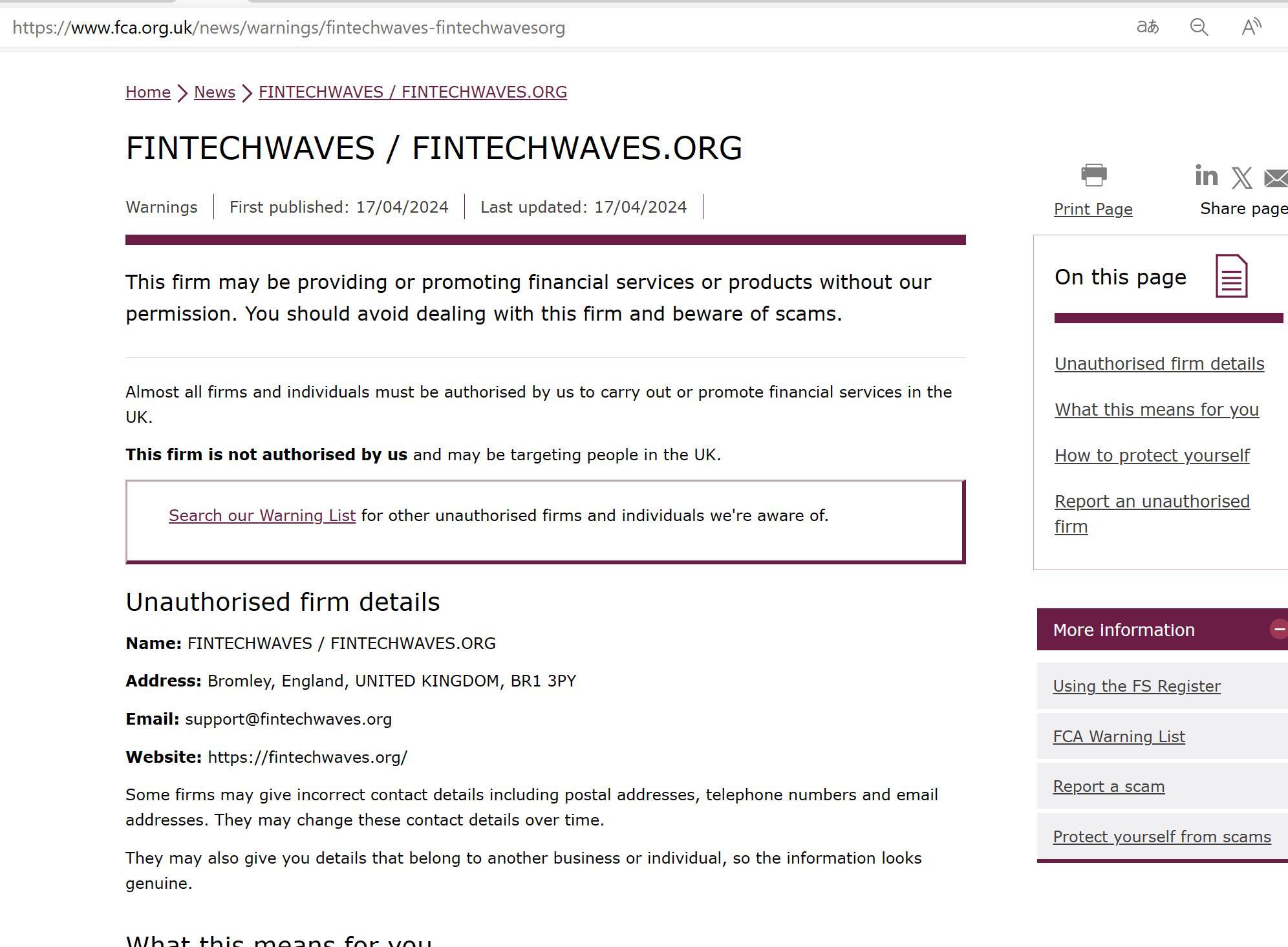 FCA द्वारा अनधिकृत फर्मों की चेतावनी सूची FINTECHWAVES.