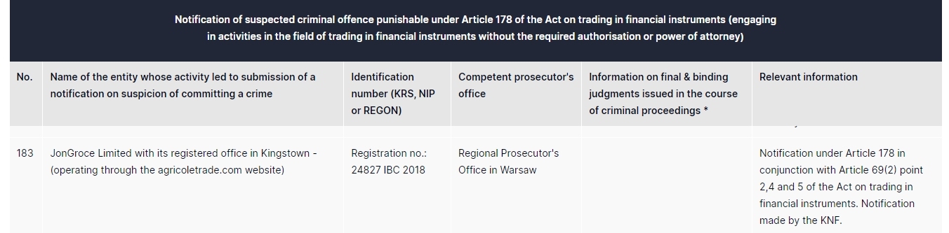 जॉनग्रोस लिमिटेड जिसका पंजीकृत कार्यालय किंग्सटाउन में है - (agricoletrade.com वेबसाइट के माध्यम से परिचालन) पंजीकरण संख्या: 24827 IBC 2018 वारसॉ में क्षेत्रीय अभियोजक कार्यालय वित्तीय साधनों में व्यापार पर अधिनियम के अनुच्छेद 69(2) बिंदु 2,4 और 5 के साथ अनुच्छेद 178 के तहत अधिसूचना। KNF द्वारा की गई अधिसूचना।